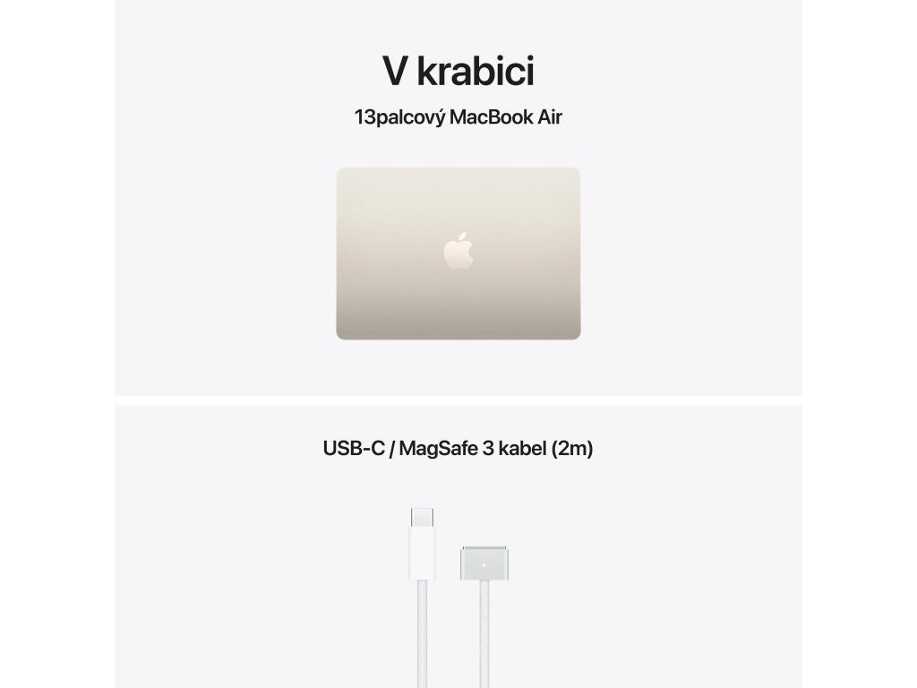 Apple MacBook Air 13'' s čipem M5 *Apple Intelligence Operační systém: macOS Procesor: Apple M5, 10jádrové CPU (4P+6E), 10jádrové GPU, 16jádrový Neural Engine, propustnost paměti 153 GB/s Paměť: 24GB Pevný disk: 1TB SSD Optická mechanika: ne Čtečka paměťových karet: ne Displej: 13,6'' Liquid Retina IPS, 2560×1664 při 224 pixelech na palec, LED podsvícení, 500 nitů, True Tone Audio: 4x reproduktor, Dolby Atmos, 3x mikrofon Webkamera: 12Mpx Center Stage, 1080p HD video Polohovací zařízení: Force Touch trackpad Podsvícená klávesnice: ano Layout klávesnice: CZ Numerická klávesnice: ne Čtečka otisků prstů: Touch ID Síť: ne Bezdrátová komunikace: Wi-Fi 7 (802.11be) + Bluetooth 6 Porty USB: *2x Thunderbolt/USB 4 (nabíjení, DisplayPort, Thunderbolt 4: až 40Gb/s, USB4: až 40Gb/s) Ostatní porty: *1x MagSafe 3 *1x 3,5mm sluchátkový konektor Baterie: vestavěná 66,5Wh lithium-polymerová Výdrž baterie: až 15 hodin bezdrátového prohlížení webu Napájení: napájecí adaptér se prodává zvlášť (minimální příkon potřebný k nabíjení zařízení je 35 W) Barva: hvězdně bílá Rozměry: 304,1x215x11,3mm Hmotnost: 1,23kg V krabici: *13'' MacBook Air *USB-C/MagSafe 3 kabel (2m) *CZ návod součástí balení Záruka: 1 rok