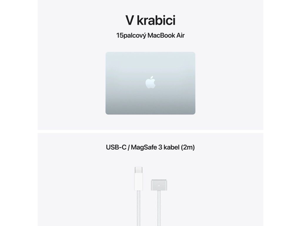 Apple MacBook Air 15'' s čipem M5 *Apple Intelligence Operační systém: macOS Procesor: Apple M5, 10jádrové CPU (4P+6E), 10jádrové GPU, 16jádrový Neural Engine, propustnost paměti 153 GB/s Paměť: 24GB Pevný disk: 1TB SSD Optická mechanika: ne Čtečka paměťových karet: ne Displej: 15,3'' Liquid Retina IPS, 2880×1864 při 224 pixelech na palec, LED podsvícení, 500 nitů, True Tone Audio: 6x reproduktor s wooferem, Dolby Atmos, 3x mikrofon Webkamera: 12Mpx Center Stage, 1080p HD video Polohovací zařízení: Force Touch trackpad Podsvícená klávesnice: ano Layout klávesnice: CZ Numerická klávesnice: ne Čtečka otisků prstů: Touch ID Síť: ne Bezdrátová komunikace: Wi-Fi 7 (802.11be) + Bluetooth 6 Porty USB: *2x Thunderbolt/USB 4 (nabíjení, DisplayPort, Thunderbolt 4: až 40Gb/s, USB4: až 40Gb/s) Ostatní porty: *1x MagSafe 3 *1x 3,5mm sluchátkový konektor Baterie: vestavěná 66,5Wh lithium-polymerová Výdrž baterie: až 15 hodin bezdrátového prohlížení webu Napájení: napájecí adaptér se prodává zvlášť (minimální příkon potřebný k nabíjení zařízení je 140 W) Barva: ,blankytně modrá Rozměry: 340,4x237,6x11,5mm Hmotnost: 1,51kg V krabici: *15'' MacBook Air *USB-C/MagSafe 3 kabel (2m) *CZ návod součástí balení Záruka: 1 rok