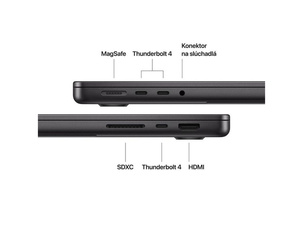 PRIPOJ SI VŠETKO – MacBook Pro má tri porty Thunderbolt 4, nabíjací port MagSafe 3, slot na kartu SDXC, port HDMI a konektor na slúchadlá. A podporuje až dva externé displeje.