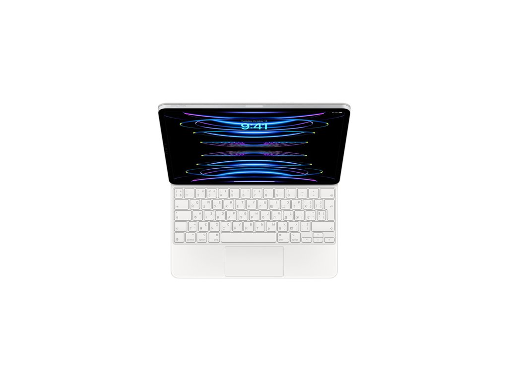 Magic Keyboard k 12,9'' iPadu Pro (6. generace) Magic Keyboard je dokonalý doplněk 12,9'' iPadu Pro. Výborně se na něm píše, má trackpad s novými možnostmi ovládání iPadOS a taky USB-C port na nabíjení iPadu. Chrání ho zepředu i zezadu. iPad Pro se k plovoucí konzolové konstrukci Magic Keyboardu přichycuje magneticky, takže ho hladce nastavíš přesně do takového úhlu, ve kterém se ti na něj dívá nejlíp. * Pohodlné podsvícené klávesy a nůžkový mechanismus s 1mm zdvihem pro tiché psaní s příjemnou odezvou. * Navržený pro Multi-Touch gesta a kurzor v iPadOS. * Hladce si nastavíš přesně takový úhel, ve kterém se ti na obrazovku dívá nejlíp. * Má port USB-C na nabíjení iPadu Pro, takže si k volnému portu iPadu můžeš připojit další doplňky. * V zavřeném stavu chrání iPad Pro z obou stran. Rozložení klávesnice: ukrajinské Barva: bílá Požadavky na systém: 12,9'' iPad Pro (3., 4., 5. nebo 6. generace) s iPadOS 14.5 nebo novějším Kompatibilita: modely 12,9'' iPad Pro (6. generace, 5. generace, 4. generace, 3. generace)