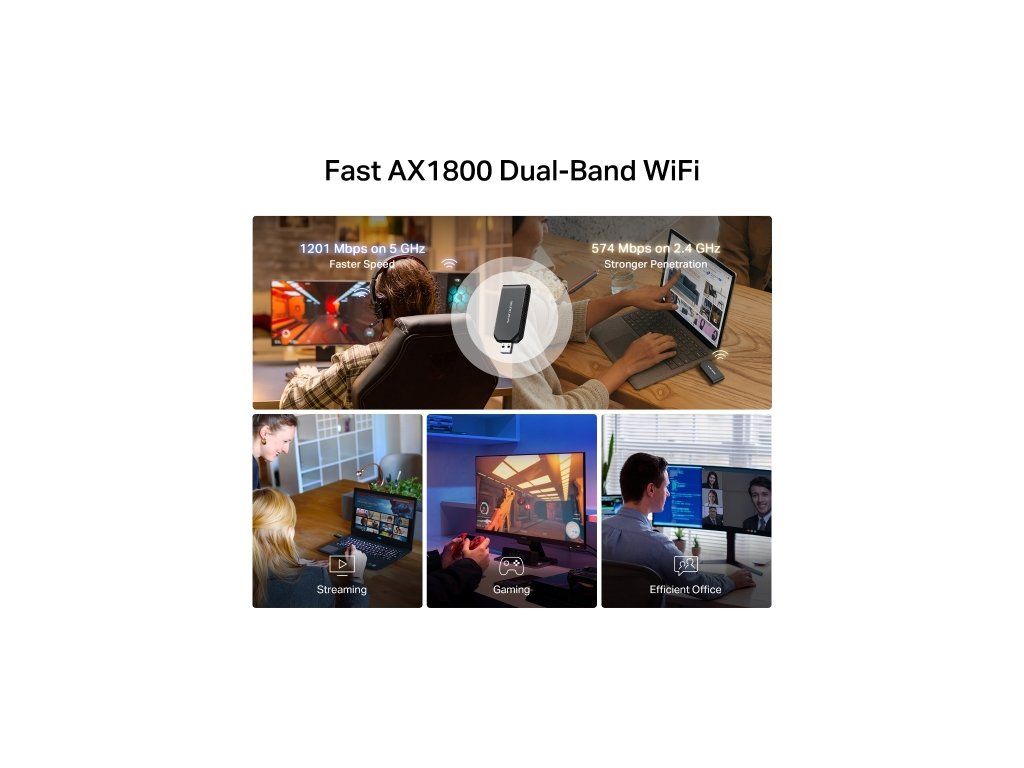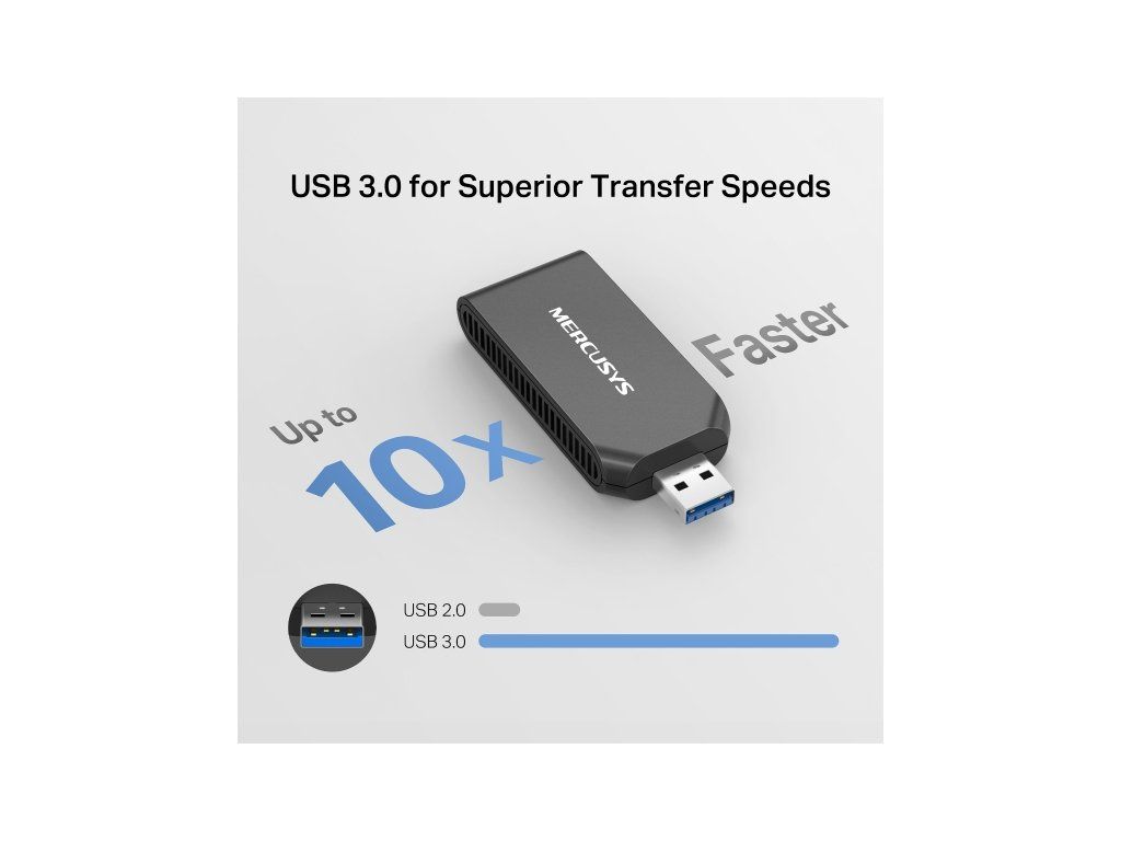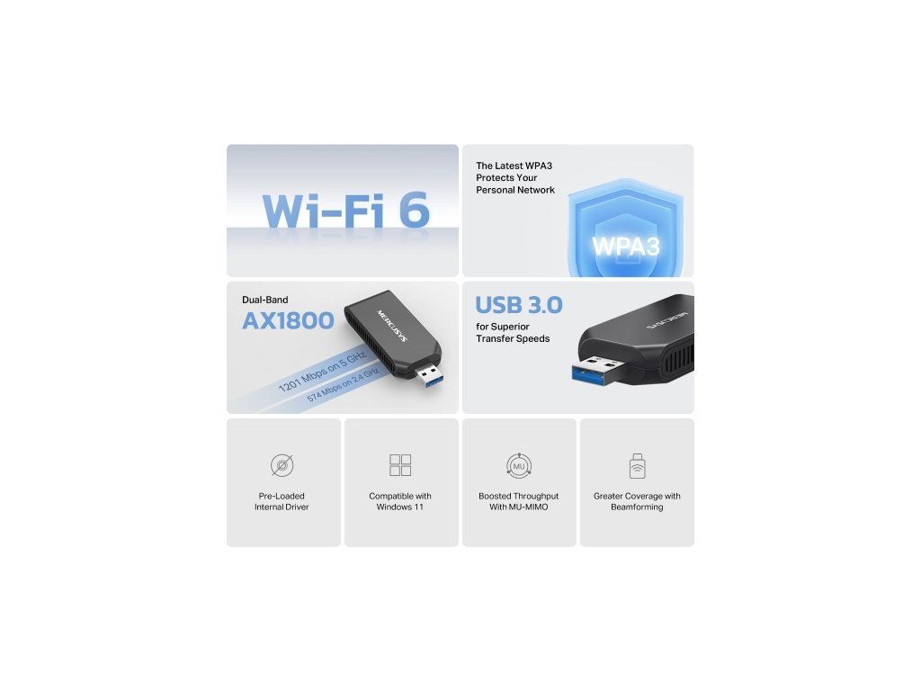 Bezdrátový USB adaptér Wi-Fi 6 MERCUSYS MA70XM Zažijte vysokorychlostní Wi-Fi 6, která zvládne více zařízení najednou a poskytne bezpečný a rychlý internet pro hraní, streamování i práci z domova. * Silná dvoupásmová Wi-Fi: Rychlost až 1201 Mb/s na 5 GHz a 574 Mb/s na 2,4 GHz 1 * Předinstalovaný interní ovladač: Snadná instalace a okamžité použití bez složité konfigurace * MU-MIMO: Současné připojení více zařízení bez zpomalení nebo zahlcení sítě 2 * Vylepšené zabezpečení: WPA3 pro ochranu vašich dat a zařízení 3 * Zpětná kompatibilita: Podpora standardů Wi-Fi 802.11ax/ac/a/b/g/n 1 * Vynikající přenosové rychlosti: Perfektní pro HD streamování, online hraní a stahování velkých souborů * Kompatibilní s Windows: Podporované OS: Windows 10, 11 Bezdrátové parametry * Standardy: IEEE 802.11 a/n/ac/ax 5 GHz, IEEE 802.11 b/g/n 2,4 GHz * Rychlosti signálu: 1201 Mbps (5 GHz), 574 Mbps (2,4 GHz) Citlivost příjmu: * 2,4 GHz 11ac 20M MCS0: -94 dBm * 2,4 GHz 11ax 40M MCS11: -62 dBm * 5 GHz 11ac 20M MCS0: -95 dBm * 5 GHz 11ax 80M MCS11: -62 dBm Bezpečnost Wi-Fi: WPA/WPA2/WPA-PSK/WPA2-PSK/WPA3-SAE Hardware * Rozměry (Š × V × H): 77 × 30 × 12,4 mm * Rozhraní: USB 3.0 * Typ antény: Interní Obsah balení * AX1800 Wi-Fi 6 Wireless USB Adapter (MA70XM) * Rychlý instalační průvodce Systémové požadavky: Windows 11 / 10 (32/64 bit) Odkaz na web výrobce: https://www.mercusys.com/cz/product/details/ma70xm Legenda: 1 Skutečná rychlost Wi-Fi se může lišit v závislosti na síťových podmínkách, rušení a konfiguraci sítě. 2 MU-MIMO výkon závisí na podpoře více zařízení a kompatibilních routerech. 3 WPA3 poskytuje vyšší zabezpečení než WPA2, ale vyžaduje kompatibilní zařízení.