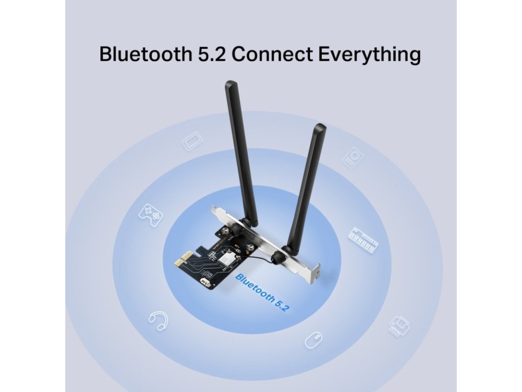 MA86XE je bezdrátový adaptér do slotu PCI express, díky kterému můžete ve svém stolním počítači nebo jiném kompatibilním zařízení využívat výhod standardu WiFi 6E (802.11ax) s celkovou rychlostí až 5.4Gbps (2402Mbps @ 6GHz, 2402Mbps @ 5GHz, 574Mbps @ 2.4GHz). Zpětná kompatibilita se staršími standardy 802.11ac/a/b/g/n je zajištěna. Karta podporuje nejmodernější šifrovací algoritmus WPA3, Vaše data tak budou v kombinaci s kompatibilním routerem zcela v bezpečí. Karta má navíc integrovaný bluetooth, takže připojení Vašich periferií nebude žádný problém.