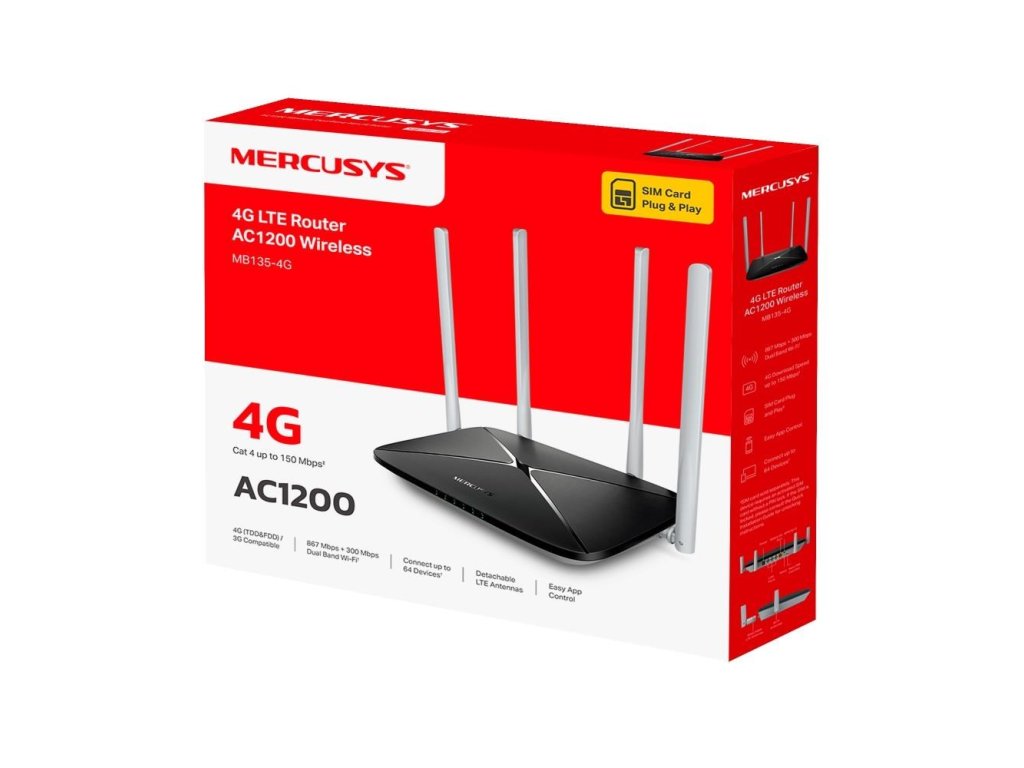 Mercusys MB135-4G WiFi5 router (AC1200, 4G LTE, 2,4GHz/5GHz,1x100Mb LAN/WAN,3x100Mb LAN,1xnanoSIM) TP-link