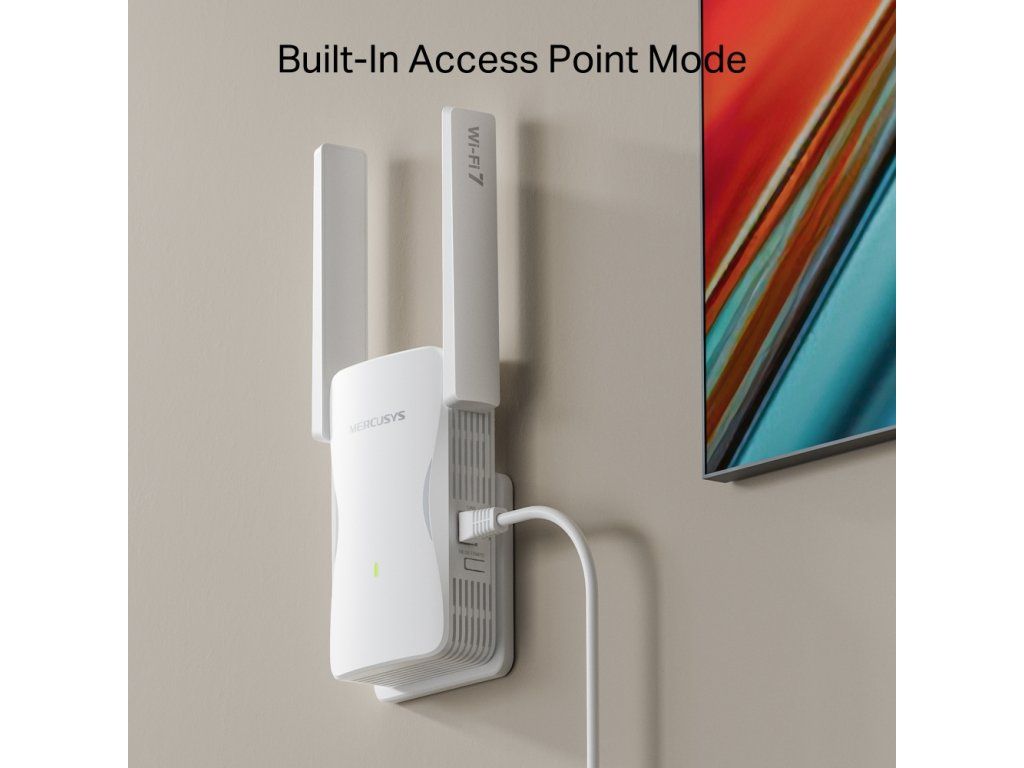 Mercusys ME25BE BE3600 dvoupásmový Wi-Fi 7 opakovač signálu Vlastnosti *Odstranění mrtvých zón Wi-Fi: Posiluje Wi-Fi signál i v těžko dostupných nebo nepokrytých místech *BE3600 dvoupásmová Wi-Fi: Rychlost až 3600 Mbps (2882 Mbps na 5 GHz, 688 Mbps na 2,4 GHz) *Snadné nastavení jedním tlačítkem: Stačí stisknout tlačítko WPS pro rozšíření Wi-Fi během pár vteřin *Kompatibilní s EasyMesh: Spolupracuje s routery a extendery s technologií EasyMesh pro bezproblémové pokrytí celé domácnosti *Indikátor signálu: Vícebarevná LED pomáhá najít nejlepší místo pro umístění zařízení *Rychlý 1000 Mbps port: Poskytuje rychlé kabelové připojení pro PC, IPTV nebo herní konzole *Funguje s libovolným routerem nebo přístupovým bodem: Lze připojit přes Ethernet a používat jako dvoupásmový přístupový bod Bezdrátové parametry *Wi-Fi standardy: IEEE 802.11a/n/ac/ax/be (5 GHz), IEEE 802.11b/g/n/ax/be (2,4 GHz) *Frekvence: 2,4 GHz – 2,5 GHz a 5 GHz *Rychlost přenosu: Až 3600 Mbps (2882 Mbps na 5 GHz, 688 Mbps na 2,4 GHz) *Vysílací výkon: 2,4 GHz ? 15 dBm, 5 GHz ? 22 dBm *Bezpečnost: WPA-PSK / WPA2-PSK / WPA3 Hardwarové parametry *Rozměry (Š × H × V): 132 × 78 × 33,04 mm *Rozhraní: 1× RJ45 port 10/100/1000 Mbps *Tlačítka: Reset / WPS tlačítko *Spotřeba energie: 13,2 W Web výrobce: https://www.mercusys.com/cz/product/details/me25be/#overview