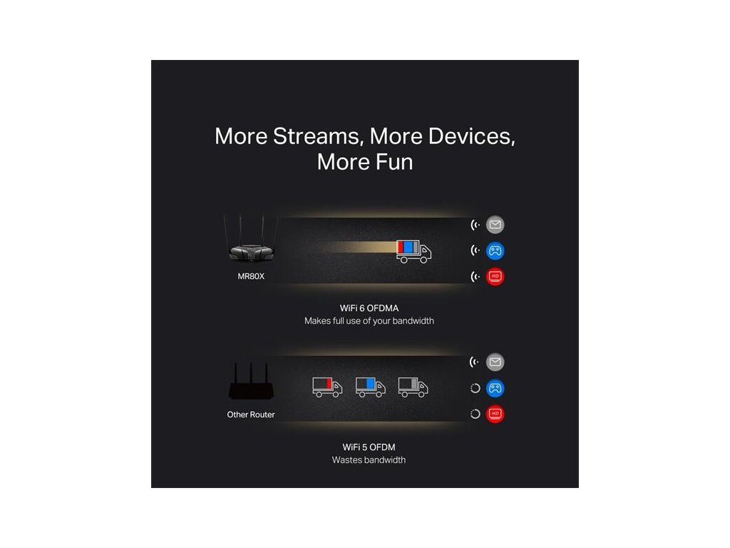 VIAC ZARIADENÍ, VIAC ZÁBAVY – Podporuje MU-MIMO a OFDMA na zníženie preťaženia a štvornásobné zvýšenie priemernej priepustnosti.
