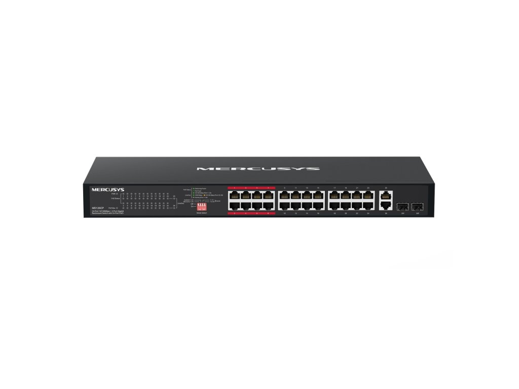 MS126CP – 24portový PoE+ rackový switch Switch nabízí 24× 10/100 Mb/s PoE+ portů, 2× gigabitové combo RJ45 porty a 2× gigabitové combo SFP sloty pro uplink. Podporuje napájení PoE+ až 30 W na port s celkovým PoE rozpočtem 295 W. Funkce Extend Mode umožňuje přenos napájení i dat až na vzdálenost 250 m. Switch dále nabízí režimy Isolation a Priority pro stabilní a bezpečný provoz a funkci PoE Auto Recovery pro automatický restart neodpovídajících PoE zařízení. Instalace je Plug and Play bez nutnosti konfigurace. Hlavní vlastnosti * 24× 10/100 Mb/s PoE+ RJ45 portů * 2× gigabitový combo RJ45 uplink port * 2× gigabitový combo SFP slot * PoE výkon až 30 W na port * Celkový PoE rozpočet 295 W * Extend Mode – přenos PoE a dat až do 250 m * Isolation Mode – oddělení provozu mezi porty * Priority Mode – priorita pro citlivé aplikace (např. kamerové systémy) * PoE Auto Recovery – automatický restart neodpovídajících PoE zařízení * Plug and Play instalace bez konfigurace Rozhraní * 24× PoE+ 10/100 Mb/s RJ45 port * 2× gigabitový combo RJ45 port * 2× gigabitový combo SFP slot PoE Standard: IEEE 802.3af / 802.3at PoE porty: 1–24 Výkon na port: až 30 W PoE rozpočet: 295 W Výkon Switching kapacita: 8.8 Gbps Forwarding rate: 6.54 Mpps MAC address table: 16K Jumbo frame: 16 KB Přenosová metoda: Store-and-Forward Síťová média * 10BASE-T: UTP Cat3/4/5, STP (max. 100 m) * 100BASE-TX: UTP Cat5/5e, STP (max. 100 m) * 1000BASE-T: UTP Cat5/5e/6 nebo vyšší, STP (max. 100 m) * 1000BASE-X: MMF, SMF Napájení a provoz Napájení: 100–240 V AC, 50/60 Hz Max. spotřeba: 11.72 W (bez PD), 326.95 W (s 295 W PD) Max. tepelný výkon: až 1168.47 BTU/h Ventilátory: 2 Bezpečnostní zámek: ano Rozměry a konstrukce Rozměry: 440 × 180 × 44 mm Provozní podmínky Provozní teplota: -5 až 45 °C Skladovací teplota: -40 až 70 °C Provozní vlhkost: 10–90 % RH (nekondenzující) Skladovací vlhkost: 5–90 % RH (nekondenzující) Certifikace * CE * RoHS Obsah balení * MS126CP * Napájecí kabel * Instalační příručka * 2× montážní držák a montážní příslušenství Odkaz na web výrobce: https://www.mercusys.com/en/product/details/ms126cp/