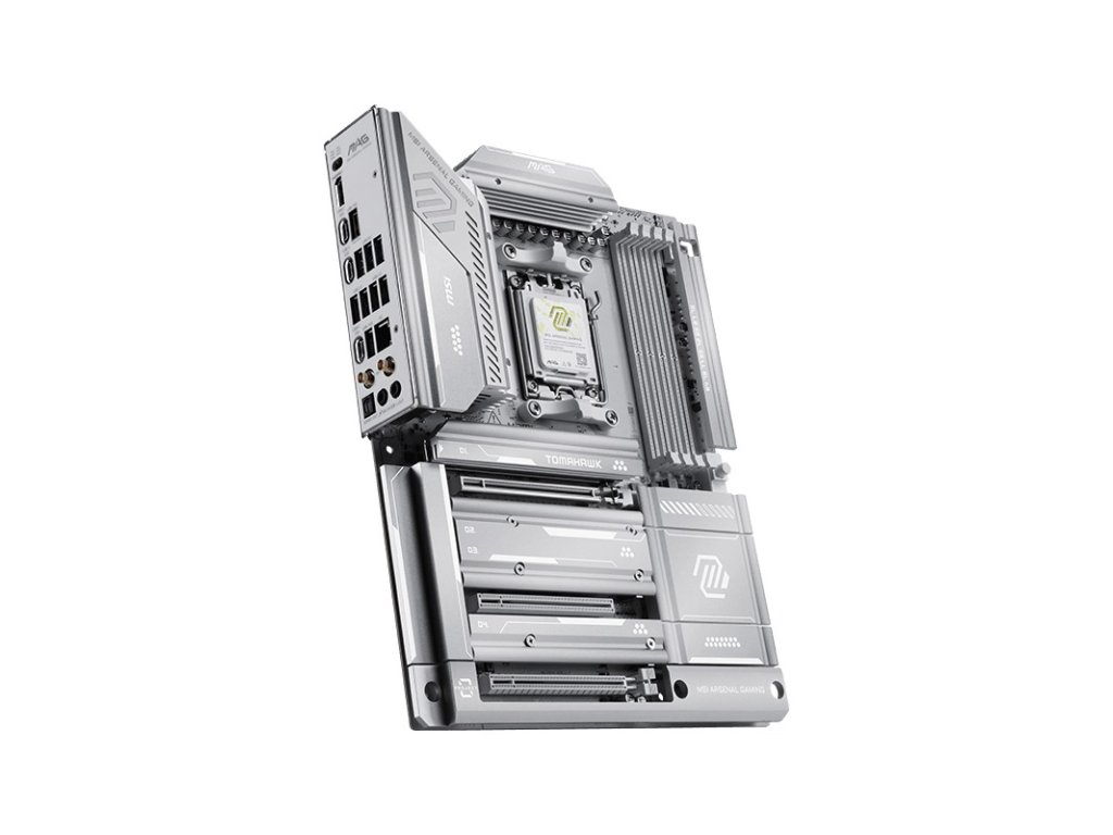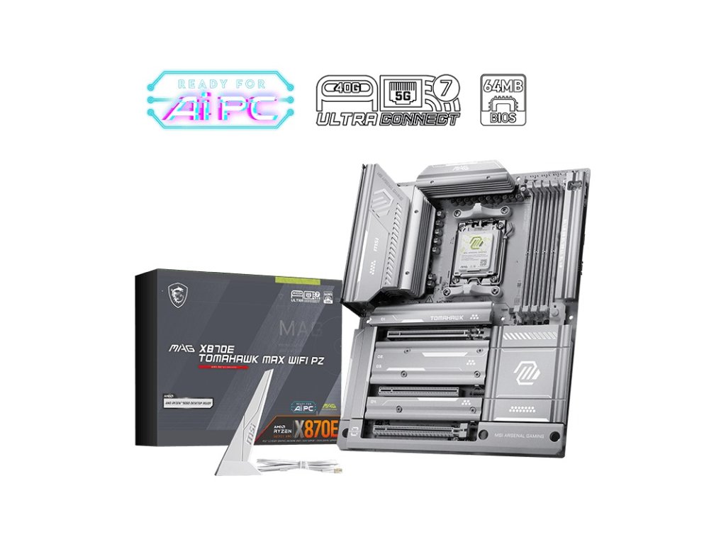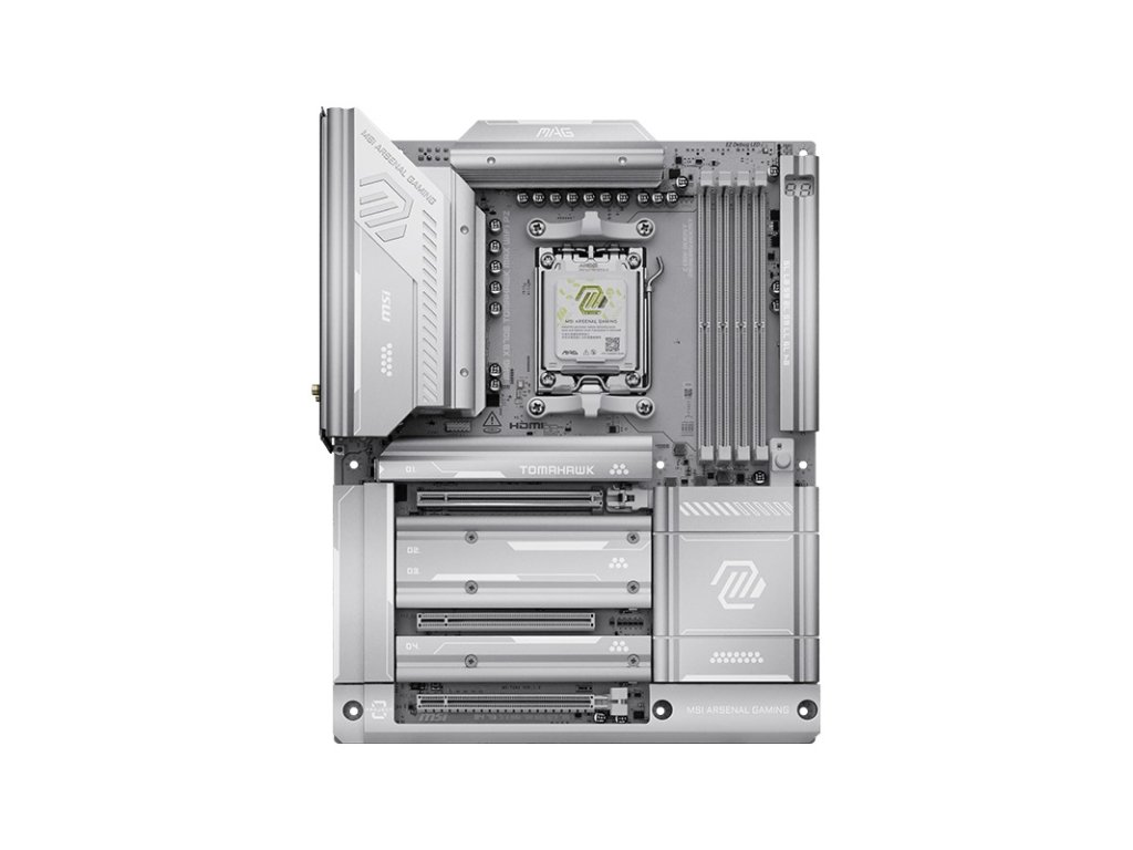 MSI MAG X870E TOMAHAWK MAX WIFI PZ * Frozr Guard * EZ DIY * EZ OC * Audio Boost 5 Chipset: AMD X870E Rozměrový formát: ATX (304,8x243,84mm) Podpora pro procesory: AMD Ryzen™ řady 9000/8000/7000 Patice procesoru: AM5 Paměť: * 4x DDR5 UDIMM, maximální kapacita paměti 256GB, podpora paměti 8400-5600 (OC) MT/s/5600-4800 (JEDEC) MT/s * max. frekvence přetaktování: • 1DPC 1R rychlost až 8400+ MT/s • 1DPC 2R rychlost až 6400+ MT/s • 2DPC 1R rychlost až 6400+ MT/s • 2DPC 2R rychlost až 6400+ MT/s * podpora AMD POR Speed a JEDEC Speed * podpora přetaktování paměti a AMD EXPO™ * podpora Non-ECC, bez vyrovnávací paměti * podpora CUDIMM, pouze Clock Driver bypass mode * dvoukanálová architektura paměti Grafické výstupy: (Specifikace grafiky se mohou lišit v závislosti na nainstalovaném CPU.) * 1x HDMI™ 2.1 s portem FRL, maximální rozlišení 8K 60Hz * 2x DisplayPort USB4® typu C, podpora DisplayPort 1.4 s HBR3 přes USB typ C, maximální rozlišení 4K 120Hz Zvuková karta: kodek Realtek® ALC4080, 7.1kanálový zvuk, podpora přehrávání až 32bit/384 kHz (na předním panelu), podpora výstupu S/PDIF Ethernet: Realtek® 8126 5G LAN WLAN + Bluetooth: Wi-Fi 7 + Bluetooth® 5.4 (bezdrátový modul je předinstalován ve slotu M.2 Key-E) Rozšiřující sloty: 3x PCI-E x16: * PCI_E1 Gen PCIe 5.0 x16 * PCI_E2 Gen PCIe 3.0 x1 * PCI_E3 Gen PCIe 4.0 x4 PCI_E1: - podpora PCIe 5.0 x16 (pro procesory Ryzen™ 9000/7000) - podpora PCIe 4.0 x8 (pro procesory Ryzen™ 8700/8600/8400) - podpora PCIe 4.0 x4 (pro procesory Ryzen™ 8500/8300) Úložný prostor: celkem podporuje 4 sloty M.2 a 4 porty SATA 6Gb/s * M.2_1 (CPU) podporuje až PCIe 5.0 x4, podpora 22110/2280 zařízení * M.2_2 (CPU) podporuje až PCIe 5.0 x4, podpora 2280/2260 zařízení * M.2_3 (čipset) podporuje až PCIe 4.0 x4, podpora 2280/2260 zařízení * M.2_4 (čipset) podporuje až PCIe 4.0 x4, podpora 2280/2260 zařízení * 4x port SATA 6Gb/s RAID řadič: podpora RAID 0/1/10 pro úložná zařízení SATA a podpora RAID 0/1/(5)/10 pro úložná zařízení M.2 NVMe USB: Zadní USB (celkem 12 portů) * 2x USB 4.0 40Gb/s (typ C) * 1x USB 3.2 Gen 2 10Gb/s (typ C) * 2x USB 3.2 Gen 2 10Gb/s (typ A) * 3x USB 3.2 Gen 1 5Gb/s (typ A) * 4x USB 2.0 Přední USB (celkem 9 portů) * 1x USB 20Gb/s (typ C) * 4x USB 5Gb/s (typ A) * 4x USB 2.0 Porty na zadním panelu: * 2x USB 4.0 40Gb/s (typ C) * 1x USB 3.2 Gen 2 10Gb/s (typ C) * 2x USB 3.2 Gen 2 10Gb/s (typ A) červený * 3x USB 3.2 Gen 1 5Gb/s (typ A) * 4x USB 2.0 * 1x HDMI™ * 1x RJ-45 5G LAN * 1x Wi-Fi/Bluetooth * 2x audio konektor * 1x S/PDIF out * 1x tlačítko Flash BIOS * 1x tlačítko Clear CMOS Interní porty: Napájení * 1x napájecí konektor (ATX_PWR) * 2x napájecí konektor (CPU_PWR) * 1x napájecí konektor (PCIE_PWR 8pin) Související s ventilátorem a chlazením * 1x ventilátor CPU * 1x kombinovaný ventilátor (Pump_Sys Fan) * 6x systémový ventilátor Související s úložištěm * 4x SATA 6Gb/s konektor * 4x slot M.2 (M-Key) USB * 4x USB 2.0 * 4x USB 5Gb/s (typ A) * 1x USB 20Gb/s (typ C) Osvětlení LED * 3x adresovatelný V2 RGB LED konektor (JARGB_V2) * 1x RGB LED konektor (JRGB) * 4x EZ Debug LED * 1x EZ Digit Debug LED * 1x EZ Detection Memory LED Ostatní * 1x EZ Conn-header (JAF_2) * 2x Front Panel (JFP) * 1x Chassis Intrusion (JCI) * 1x Front Audio (JAUD) * 1x TPM pin header (podpora TPM 2.0) * 2x Direct OC Jumper (JBCLK) Příslušenství: * 2x SATA 6Gb/s kabel * 1 na 3 EZ Conn-kabel (V2) * EZ Front Panel kabel * EZ Wi-Fi anténa * M.2 šroub * USB Drive * sada nálepek * 3x EZ M.2 Clip II * EZ M.2 Clip II Remover (klíč) * uživatelská příručka Odkaz na stránku výrobce: https://www.msi.com/Motherboard/MAG-X870E-TOMAHAWK-MAX-WIFI-PZ