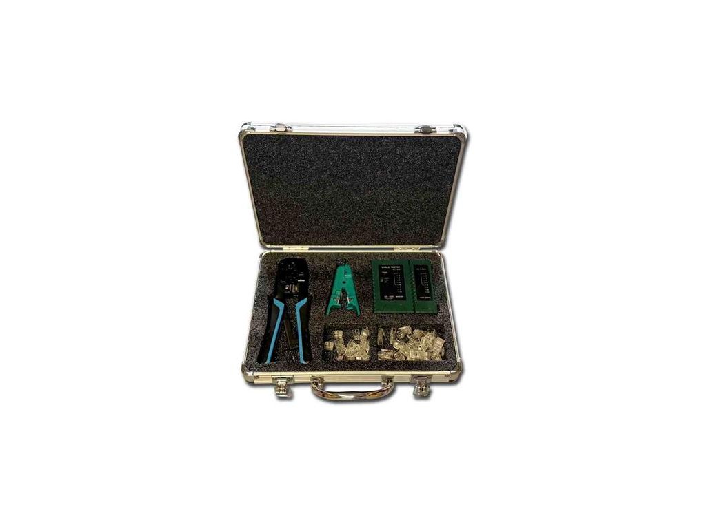Kufr hliník 30 x 22 x 6,5 cm Hmotnost 0,3 kg Led tester Konektorovací kleště 8P 6P Ořezávací nástroj Konektory RJ45 Konektory RJ12