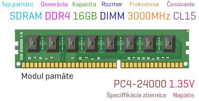 | Frekvencia modulu | Udáva akou maximálnou rýchlosťou je daná pamäť schopná spracovať dáta t.j. koľko operácií za sekundu dokáže vykonať. Udáva sa v MHz, alebo MT/s. Každá vyššia generácia DDR má dvojnásobný takt pamäťovej zbernice a preto aj max. frekvencia je 2x vyššia. Čím vyššia frekvencia, tým vyšší výkon. Pre výkonný počítač je potrebné použiť RAM s 3000 MHz a viac. |