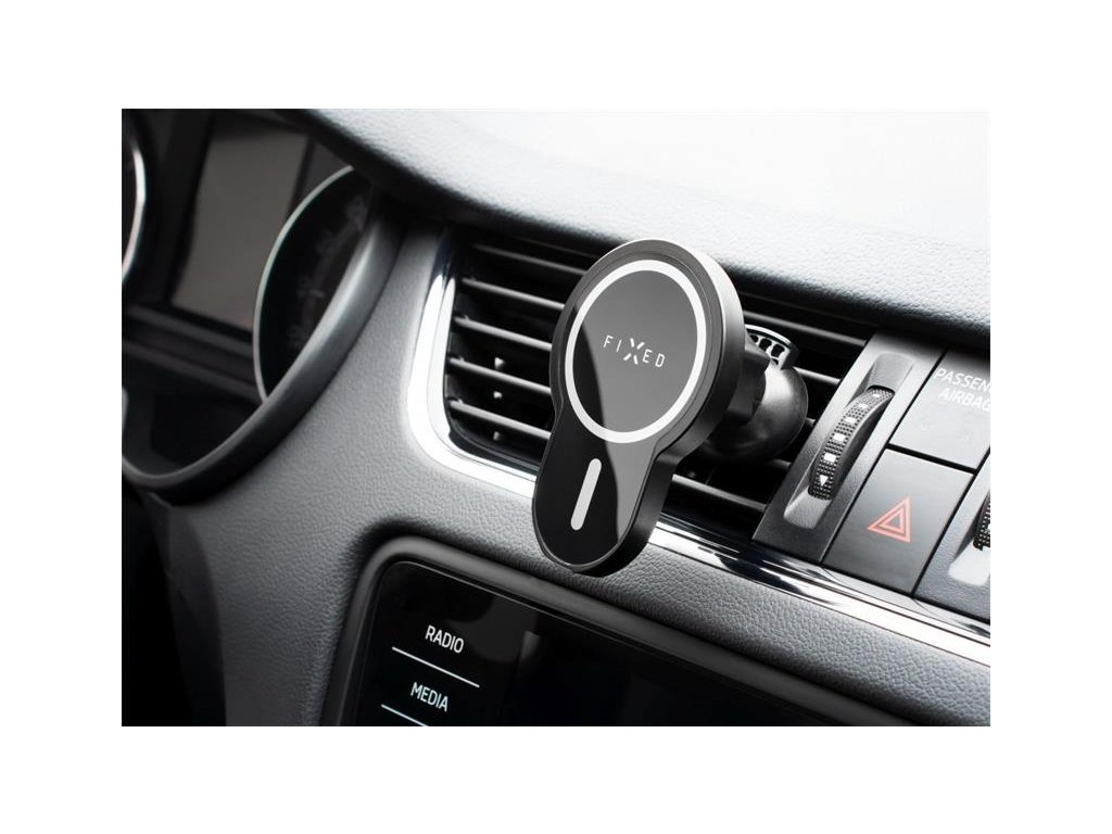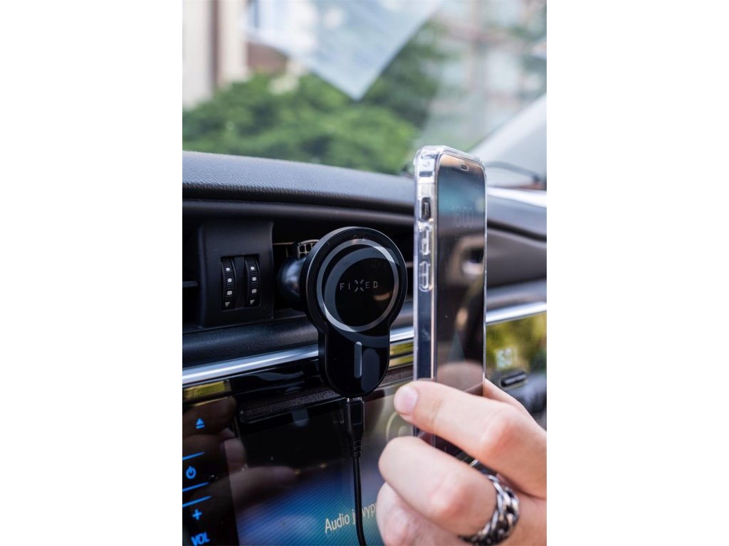 Držiak FIXED MagClick vyvinutý priamo pre najnovšie Apple iPhone s funkciou MagSafe vám umožní mať telefón v aute pekne na očiach a zároveň ho pohodlne dobíjať počas jazdy. Vďaka integrovaným magnetom stačí len priložiť telefón k držiaku a pomocou MagSafe sa okamžite sám zaistí. Drží bezpečne a bez problémov vydrží všetky otrasy spôsobené jazdou. Pre rýchle nabíjanie vášho iPhonu je držiak MagClick vybavený vysoko výkonnou cievkou s výkonom 7,5 W a až 15 W pre ostatné chytré telefóny, dokáže tak doplniť energiu v čo najkratšom čase. Držiak je určený na uchytenie pomocou pevných klieští do ventilačnej mriežky. Pomocou otočného kĺbu si nastavíte telefón do ideálneho uhla tak, aby bol v prípade potreby pekne na očiach. Minimalistický a moderný dizajn držiaka neprekáža na palubnej doske a skvele zapadne do interiéru vášho vozidla. S držiakom FIXED MagClick bude vaša jazda s telefónom v aute pohodlnejšia a hlavne bezpečnejšia ako kedykoľvek predtým.