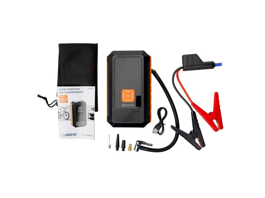 Powerbanka PMPBTP s funkcí JUMP STARTER 8000 mAh / 800 A s vestavěným kompresorem 140 PSI a svítilnou. Profesionální startovací nabíječka s kompresorem 8000 mAh je nepostradatelným zařízením pro profesionální řidiče a majitele vozidel. Díky vysokému startovacímu výkonu 800 A a robustnímu výkonu snadno nastartuje i velké benzínové i naftové motory. Vestavěný kompresor s tlakem až 140 PSI zajišťuje rychlé nafouknutí pneumatik, zatímco funkce powerbanky umožňuje nabíjet elektroniku na cestách. Už žádné starosti s vybitou baterií nebo nízkým tlakem v pneumatikách – toto zařízení vám poskytne bezpečnost, pohodlí a klid na cestách. KLÍČOVÉ VLASTNOSTI: • Výkonná baterie 8000 mAh – několik startů vozidel v nouzových situacích • Vysoký špičkový výkon 800 A – startuje benzínové motory do 6,0 l a dieselové motory do 3,0 l • Kompresor 140 PSI / 9,65 BAR – rychlé nafouknutí pneumatik, míčů, jízdních kol a nafukovacích matrací • Kapacita 25 l/min – šetří čas a rychle doplňuje vzduch • Multifunkční LCD displej – přehledné provozní parametry • Nouzové osvětlení COB 200 lm – ideální v noci a v nouzových situacích • USB port 5 V/2 A – nabíjí chytré telefony, tablety a příslušenství • Více než 300 nabíjecích cyklů – odolnost a spolehlivost TECHNICKÉ SPECIFIKACE: • Kapacita baterie: 8000 mAh • Startovací proud (špička): 800 A • Podporované motory: benzínové motory do 6,0 l, dieselové motory do 3,0 l • Kompresor: 140 PSI / 9,65 BAR • Kapacita kompresoru: 25 l/min • Displej: Multifunkční LCD • Svítilna: COB LED 200 lumenů, nouzový režim • Konektory: USB 5V/2A • Životnost: 300 nabíjecích cyklů • Rozměry: 114 x 61 x 196 mm Sada obsahuje: startovací kabel, startovací kabely, koncovky pro hustilku, USB kabel. PARAMETRY: • Kapacita: 8000 mAh • Typ: startovací box / powerbanka / kompresor • Startovací proud: 800 A • Integrovaný kompresor: 140 PSI / 9,65 BAR • Kapacita kompresoru: 25 l/min • Počet výstupů: 1 • USB-A konektor: 1 • Fast Charge: ne • Displej: ano • Svítilna: 200 lm • Typ článků: Li-Ion • Materiál: kov, plast • Barva: černá • Rozměry (Š x V x H): 114mm x 196mm x 61mm • Hmotnost: 0.7 kg