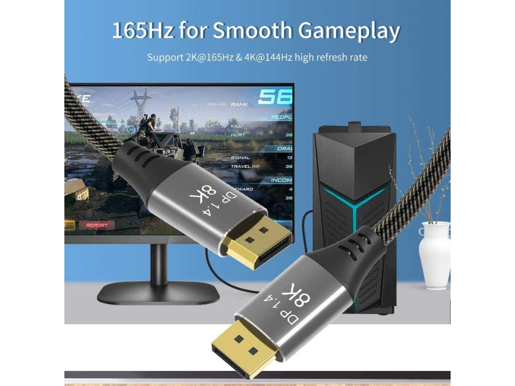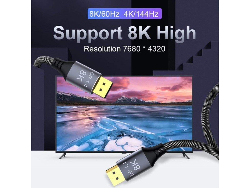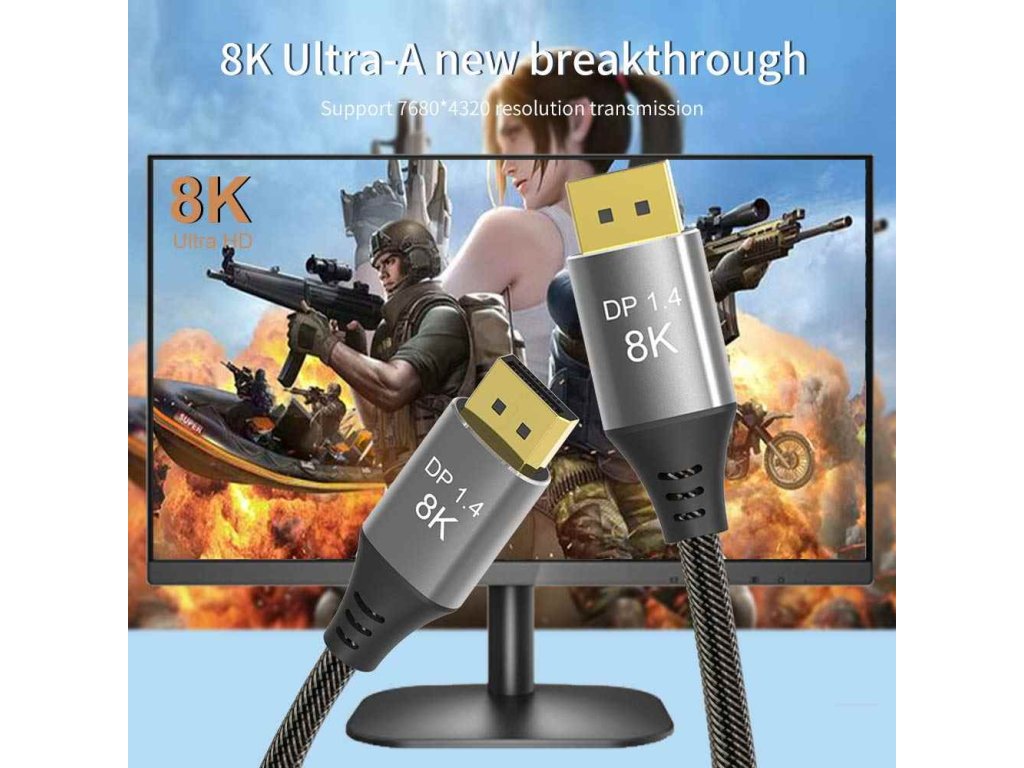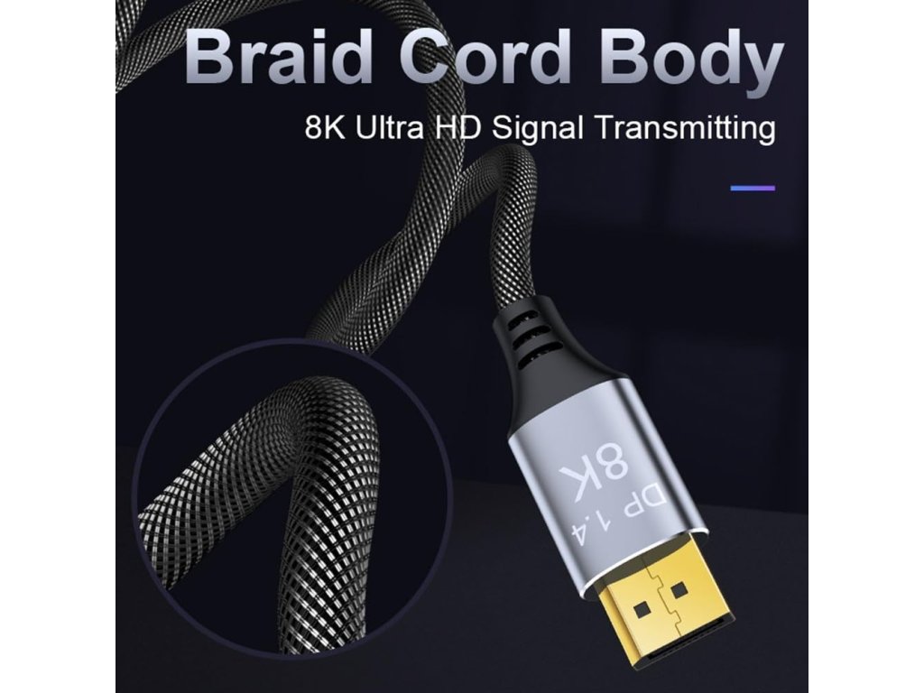 PremiumCord DisplayPort 1.4 přípojný kabel 32,4 Gbit/s, rozlišení 8K, kovové a zlacené konektory, 7,5 m Kabel je vybaven standardem DisplayPort 1.4 a poskytuje obzvláště vysokou šířku pásma, ideální pro plynulé přehrávání obrazu bez trhání obrazovky nebo trhání při hraní her a rozlišení ostré jako břitva s rozlišením až 8K nebo 4k. Špičková konstrukce kabelu jej předurčuje pro všechny druhy instalací. Jedná se o flexibilní prémiový kabel s tenkými kovovými konektory, ochranou proti ohybu a barevně sladěným textilním kabelem (opletený textilní plášť kabelu monitoru je příjemný na dotek a šetrný k citlivým povrchům). DisplayPort 1.4 zvyšuje maximální datovou rychlost o 50% oproti rychlostem datového přenosu DisplayPort 1.2 na 32,4Gbit/s. Technické parametry Maximální rozlišení: - 8K (7680x4320) při 60Hz a 24 bitová barevná hloubka - 5K (5120x2880) při 60Hz a 30 bitová barevná hloubka - 4K (3840×2160) při 144Hz a 60Hz a 24 bitová barevná hloubka - 2K (2560 × 1440) při 240Hz a 165Hz - FULL HD 1080p (1920x1080) při 240Hz - podporuje HDCP 2.2 a HDCP1.4, podporuje 3D a EDID - podporuje FreeSync a G-Sync, Dynamic HDR a také 32 audio kanálů a mnoho oblíbených audio formátů, např. DTS-HD Master Audio * Verze DisplayPort 1.4 * Maximální datový přenos: 32,4 Gb/s * Podporovaná barevná hloubka: (30 Bit), True Color (24 Bit) * Konektory: DisplayPort (20pinů) male <=> DisplayPort (20pinů) male * 20-vodičový kabel, dvojité stínění, 100% měděný vodič průřezu AWG28 * Pozlacené kontaktní plochy zajišťují optimální přenos signálu a zabraňují korozi * Kovové hliníkové krytky konektorů * Tloušťka kabelu: 7,3 mm * Kabel s měkkým bavlněným opletem: barva černo-šedá * Barva konektorů: Space Grey * Balení v PVC sáčku s EAN kódem a popisem * Délka kabelu: 7,5 m
