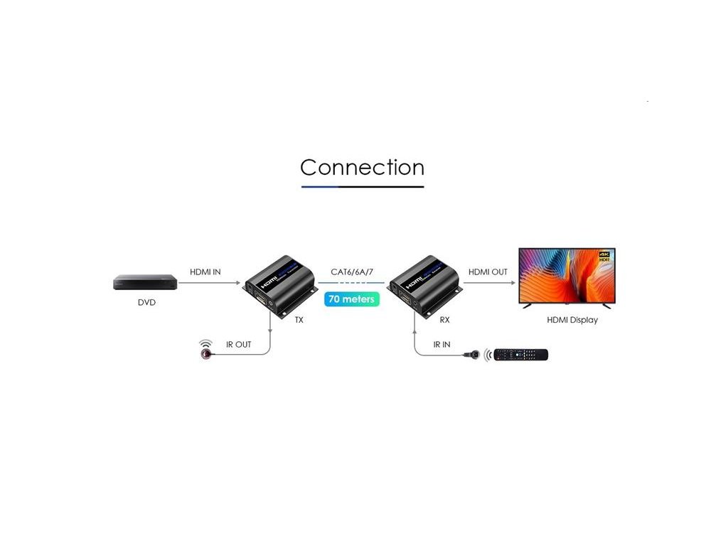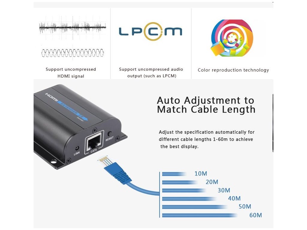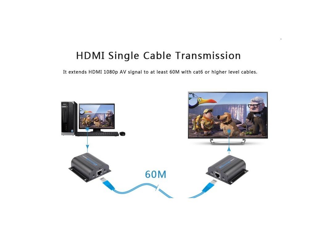 Zariadenie po jednom sieťovom kábli umožňuje preniesť HDMI FULL HD 1080p signál až na 70m.