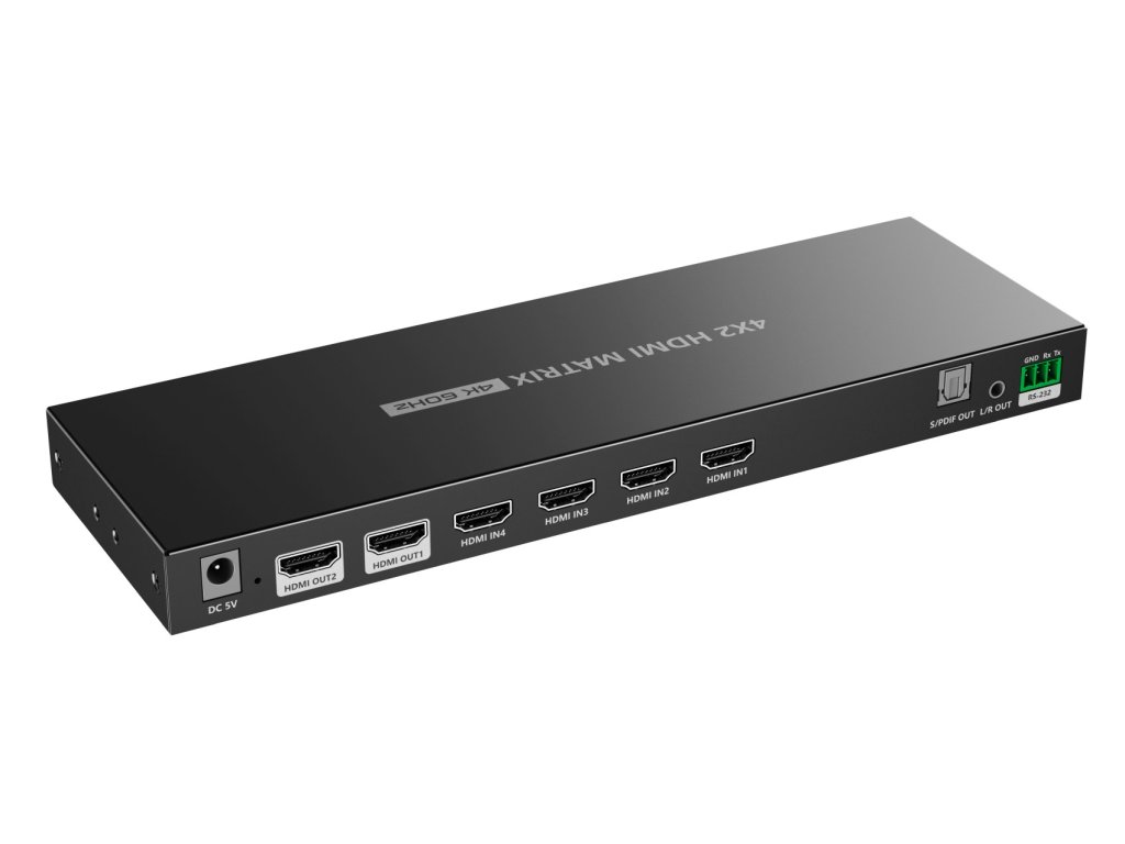 PremiumCord HDMI matrix switch 4:2 , UHD rozlišení 4Kx2K@60Hz HDR, SPDIF, Auto-Downscaling Umožní propojit více zdrojů signálu, 4 vstupy HDMI na 2 výstupy HDMI. Umožní zapojit například PC+DVD přehrávač+BlueRay k jedné TV a monitoru zároveň. Ovládání pomocí dálkového ovladače nebo dvou tlačítek na přepínači, je možné nastavit libovolný vstup na jeden z dvou výstupů. Ovládání pomocí RS232. Na předním panelu 2x4 LED, které zobrazují zvolený vstupní port pro každý výstup. - Podporuje rozlišení UHD 4Kx2K@60Hz a FULL HD 1080p - Také podporuje rozlišení: 480p, 576p, 720p, 1080i, 1080p, 3840x2160@24/25/30/50/60Hz, 4096x2160@24/25/30/50/60Hz - Podpora 3D obrazu - HDMI 2.0 ( HDR, YUV444 ) - HDCP 2.2, HDCP 1,4 - Matrix provedení 4 vstupy a 2 výstupy - Umožní připojit více vstupů (4)/ výstupů(2) - Umožní z různých čtyř zdrojů signálů posílat signál nezávisle na dva výstupy najednou - Podporuje 3D a HDTV až Full HD (1080p), 4Kx2K@60Hz - VGA,SVGA,XGA,UXGA mode kompatibilní - Maximální datový přenos : 18Gbps - Maximální rozlišení: UHD 4K (3840x2160@24/25/30/50/60Hz, 4096x2160@24/25/30/50/60Hz) - Podporovaná barevná hloubka: YUV 4:4:4 - Podporované audio formáty: LPCM7.1, DTS-HD/DTS-Audio, Dolby Digital/Plus, Dolby TrueHD, DTS-HD Master Audio+, DVD-Audio, SA-CD - Ostatní podporované standardy: 3D, HDCP, 4K (2160i/p), Full HD (1080i/p), HD ready (720i/p) - Na výstupu aktivní zesilovače, které umožní připojení zobrazovače na větší vzdálenost - Přepínání tlačítky na panelu nebo dálkovým ovládáním - V balení dálkové ovládání pro komfortní obsluhu - Umožňuje ovládání pomocí seriové linky RS232 - Napájení přiloženým adaptérem 5V / 1A, spotřeba menší než 4W - Plug and play provedení, není třeba žádný software. - Pracovní teplota: -20°C - 60°C - Vlhkost: 0-90% RN (no kondenzační) - Pouzdro: kovové - Barva : černá - Váha: 375g - Rozměry: 250 x 80 x 21 mm