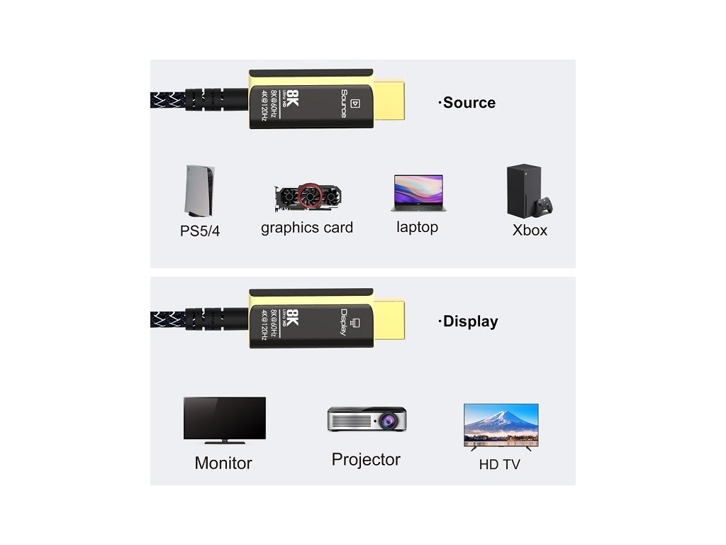 - HDMI 2.1 Ultra High Speed aktivní optický fiber kabel, podporuje HDMI2.1 nebo nižší HDMI2.0 a HDMI1.4