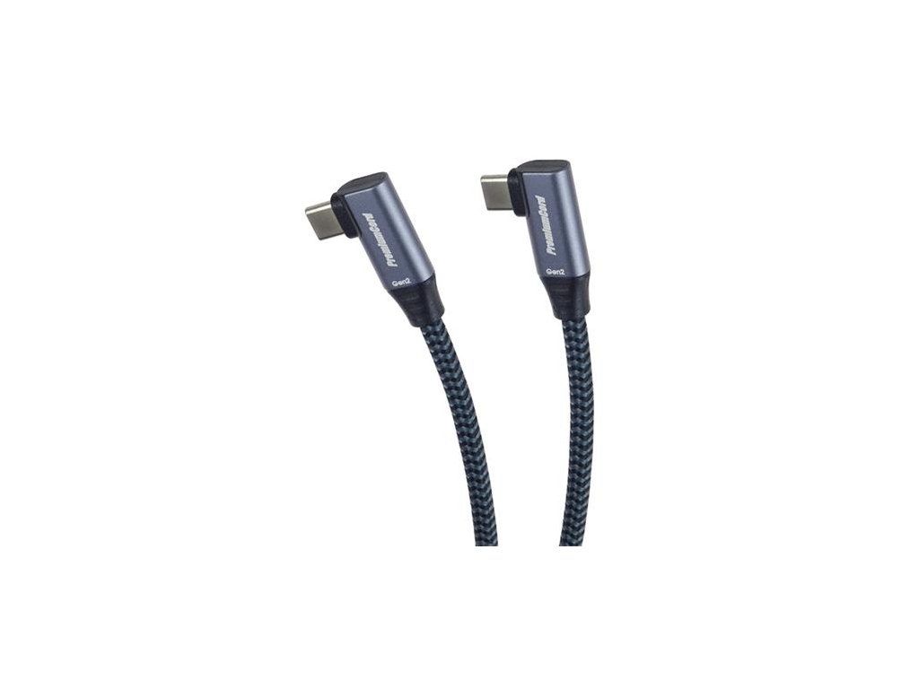 PremiumCord USB-C 2x zahnutý 90° kabel ( USB 3.2 GEN 2x2, 5A, 100W, 20Gbit/s ) hliníkové krytky konektorů, bavlněný oplet, 3m