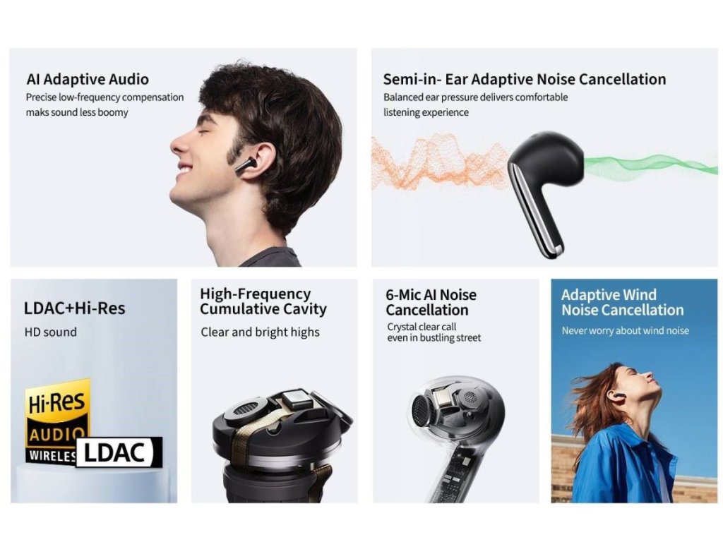 Bezdrátová sluchátka QCY HT10 AilyBuds Pro+ ANC Hi-Res Audio s LDAC, Bluetooth 5.3, 6 Mic, AI HD Call, Multipoint připojení. Adaptivní ANC: AilyBuds Pro+ detekuje vaše uši a způsob, jakým je nosíte, přizpůsobuje se vašemu uchu a dynamicky upravuje parametry pro zajištění lepšího výkonu ANC. Více režimů ANC: Ztište se, ať jste kdekoli. Účinně snižte všechny typy hluku, což vám umožní okamžitě se ponořit do pohlcujícího hudebního světa Hi-Res Audio: S kodekem LDAC a Hi-Fi 5 DSP vykresluje AilyBuds Pro+ hudbu ve výjimečně detailní zvukové kvalitě. Superior Clear Call: 6 mikrofonů a algoritmus redukce šumu na bázi umělé inteligence izoluje váš hlas a udržuje konverzace čisté Režim průhlednosti: Na výběr je až 6 úrovní povědomí. Zůstaňte při vědomí venku nebo kdykoli chcete zůstat ve spojení se svým okolím. Bluetooth 5.3 a vícebodové připojení: Spárujte se dvěma zařízeními Bluetooth současně. Rychle mezi nimi přepínejte pouhým kliknutím. Pohodlné nošení a perfektní střih: S 50° designem semi-in-ear poskytuje AilyBuds Pro+ stabilní a pohodlné nošení. AI Adaptive Audio Technologie HiFi 5 DSP poskytuje špičkové zpracování zvuku. Bezdrátová sluchátka se automaticky přizpůsobí vašemu zvukovodu a stavu nošení, s dynamickou úpravou nízké frekvence, která vám umožní vychutnat si bohaté zvukové detaily. Hi-res Wireless Certificaion with LDAC Codec QCY HT10 AilyBuds Pro+ vybavené kódováním a dekódováním zvuku LDAC, vychutnejte si přenosovou rychlost až 990 kbps a podporu vzorkovacích frekvencí 96 kHz/24 bitů. Ve srovnání s SBC může LDAC přenášet informační obsah až 3,0krát. Snižuje zkreslení zvuku a dosahuje výrazného zlepšení kvality zvuku. (Zařízení se systémem iOS nepodporují LDAC.) Adaptive Hybrid Active Noise Cancellation Po zapnutí ANC se bezdrátová sluchátka automaticky přizpůsobí vašemu zvukovodu, dynamicky detekují změny okolního hluku a stavu nošení a dynamicky upravují a přizpůsobují nejvhodnější parametry potlačení hluku v reálném čase, čímž zajistí, že okolní hluk je účinně eliminován. Konstrukce také zahrnuje vodotěsnou a adaptivní strukturu proti větru IPX5, takže jsou ideální pro outdoorové aktivity. 6 mikrofonů AI HD Call & 13mm driver Vestavěné 6mikrofonové pole snímá vokály a blokuje zvuky v různých hlučných scénách, takže si vždy můžete užít křišťálově čistý hovor. Nechte svůj hlas slyšet, hlasitě a jasně! Bluetooth 5.3 a vícebodové připojení Užijte si technologii Bluetooth 5.3, nabízí rychlejší přenos dat, nižší spotřebu energie a lepší stabilitu připojení. Připojte se ke dvěma zařízením současně, jako jsou smartphony a tablety, bez potíží s opětovným připojováním. Pohodlné nošení a dokonalé uchycení S 50° semi-in-ear designem, ergonomický design bezdrátového sluchátka QCY HT10 AilyBuds Pro+ poskytuje stabilní a pohodlné nošení, ponořte se do hudby, obsahu a hraní her. Herní režim s nízkou latencí a přizpůsobený ekvalizér aplikace Dlouhým stisknutím levého sluchátka vstoupíte do herního režimu s ultra nízkou latencí 80 ms. Synchronizovaný obraz a zvuk vám umožní přesně zachytit pozici a preventivně využít vítěznou příležitost, což je ideální pro mobilní hry. Stáhněte si aplikaci QCY, abyste si mohli snadno vybrat a přizpůsobit zvukové efekty EQ, přepínat režimy, resetovat, upgradovat, deaktivovat dotyk a další. (Poznámka: Ujišťujeme vás, že bezdrátová sluchátka fungují dobře, pokud aplikaci nezaregistrujete.) SPECIFIKACE Název produktu: QCY AilyBuds Pro+ Název párování: QCY AilyBuds Pro+ Verze Bluetooth: 5.3 Systém: iOS/Android Provozní dosah: 10m Celková výdrž baterie: cca. 23/28 hodin (ANC ON/OFF) Jedno nabití: Přibl. 4/5 hodin (ANC ON pro hudbu/ANC OFF pro hudbu) Bluetooth profily: A2DP/AVRCP/HFP Kapacita baterie (pouzdro): 350 mAh Kapacita baterie (sluchátko) 27mAh Nabíjecí port: USB-C Vodotěsnost: IPX5 Velikost sluchátka: 19,9 x 18,4 x 33,7 mm Velikost pouzdra: 51 x 51 x 28,2 mm Obsah balení Pouzdro Sluchátka Nabíjecí kabel Uživatelská příručka