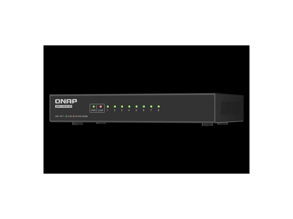 Model QSW-1108-8T-R2 je vybaven osmi ethernetovými porty 2,5 GBASE-T a podporuje standardy NBASE-T™ a Multi-Gigabit pro rychlosti 2,5G/1G/100M s celkovou přepínací kapacitou 40 Gb/s. Připojte zařízení, jako jsou stolní počítače, notebooky, NAS, přístupové body Wi-Fi 6/6E, set-top boxy a herní konzole, pro velmi plynulé zálohování, virtualizaci, editaci médií a pohlcující zábavu.