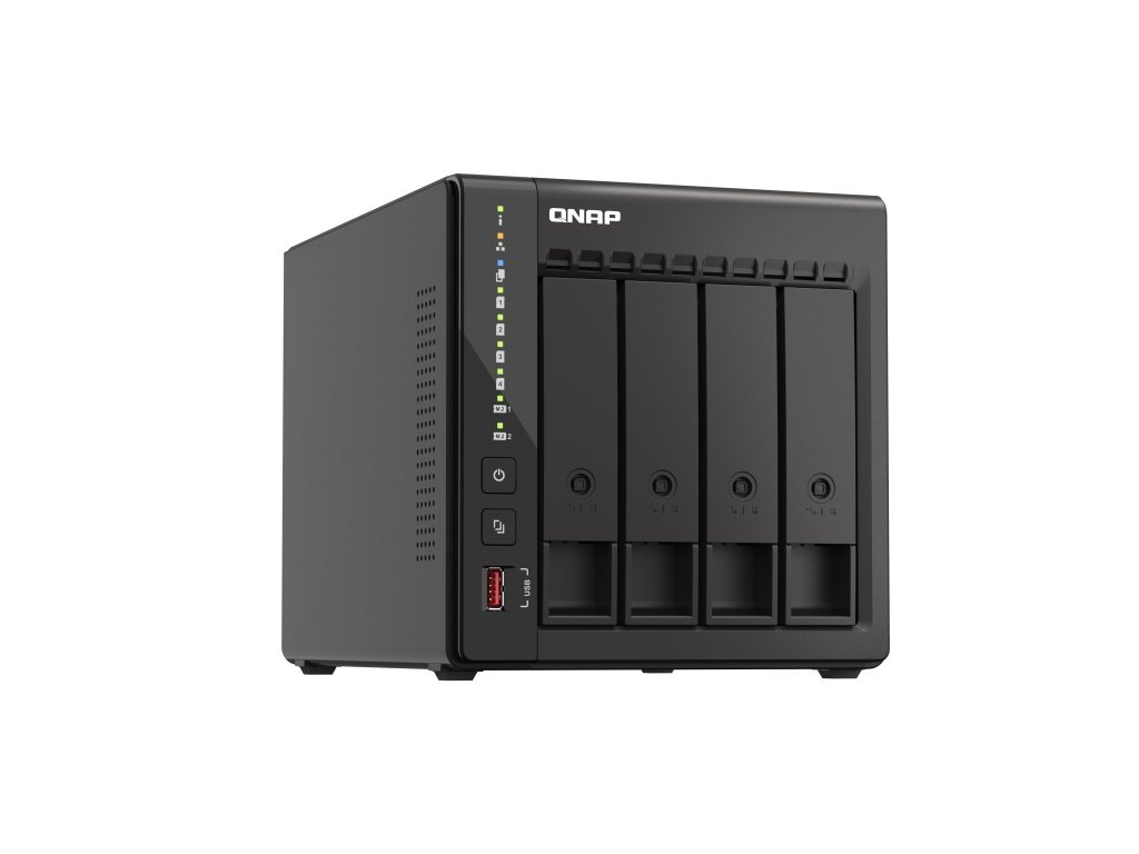 TS-453E Dva porty 2,5GbE, 8 GB RAM a dlouhodobá dostupnost Odkaz na web výrobce: https://www.qnap.com/cs-cz/product/ts-453e Seznam kompatibility pro tento model: https://www.qnap.com/cs-cz/compatibility/?model=714 Recenze CZC: https://www.czc.cz/geek/recenze-qnap-ts-253e-sikovny-vseumel/clanek Recenze DDWORLD: http://www.ddworld.cz/pc-a-komponenty/pevne-disky/qnap-ts-453e-8g-test-a-recenze-opravdu-vybavene-a-vykonne-nas.-vse-co-je-treba.html Funkce Zařízení TS-453E je vybaveno připojením 2,5GbE, 8 GB RAM a sloty M.2 pro NVMe SSD cache – tak je zajištěn vysoký výkon pro aplikace, jako jsou dozorovací systémy, virtuální počítače, souborové servery nebo zálohovací servery. Dva výstupy HDMI umožňují také přímé přehrávání multimédií a robustní sledování za účelem dozorování. Společnost QNAP bude poskytovat dlouhodobou dostupnost a podporu pro zařízení TS-453E, což je skvělá volba pro podniky, které potřebují odpovídající modely NAS nasazené na více místech. Od verze 5.2.2 již je možné do NAS nainstalovat také QuTS hero na bázi ZFS. *2,5krát vyšší rychlost sítě ve srovnání se stávajícími kabely CAT5e, podporuje sdružování portů pro přenos až 5 Gb/s. *Dosáhněte vyššího výkonu NAS instalací modulů M.2 2280 NVMe PCIe SSD (prodávají se samostatně) nebo Edge TPU. *Výkon systému a multitasking jsou optimalizovány díky 8 GB RAM. *Model #TS-453E bude k dispozici a podporován společností QNAP po prodlouženou dobu, až do roku 2029. *Rozšíření na dvě obrazovky lze použít ke sledování za účelem dozorování nebo přehrávání videa ve vysokém rozlišení 4K. *Podporuje rozšiřující jednotky USB (viz seznam kompatibility). OBSAH BALENÍ *TS-453E *Ethernet Cable x 1 *Power cord x 1 *AC Adapter *Flat head screw (for M.2 SSD) x 2 *Flat head screw (for 3.5'' HDD) x 16 *Flat head screw (for 2.5'' HDD) x 12 *Quick installation guide (QIG) *Drive tray keys x 2 SPECIFIKACE CPU *Čtyřjádrový/čtyřvláknový procesor Intel® Celeron® J6412, navýšení až na 2,6 GHz Architektura CPU *x86 64 bitů Jednotka s pohyblivou řádovou čárkou *Ano Šifrovací modul *Ano (AES-NI) Systémová paměť *8 GB na desce (bez možnosti rozšíření) Maximální paměť *8 GB Paměť Flash *4 GB (dvojitá ochrana OS při spouštění) Pozice pro diskové jednotky *4 x 3,5'' SATA 6 Gb/s Kompatibilita diskových jednotek *3,5'' SATA jednotky pevných disků *2,5'' SATA jednotky pevných disků *2,5'' SATA SSD Vyměnitelné za provozu *Ano Podpora akcelerace SSD cache *Ano Gigabitový Ethernet port (RJ45) *2 (2,5G/1G/100M/10M) Rámec Jumbo *Ano USB port *2x USB 2.0 *2x USB 3.2 Gen 2 (10 Gb/s) HDMI *2 x HDMI 1.4b (až 3840 x 2160 při 30 Hz) Tvarový činitel *Stolní Indikátory LED *Napájení, stav, LAN, USB, HDD1-4 Tlačítka *Napájení, reset, Automatické kopírování na USB Rozměry (V x Š x H) *177 × 180 × 235 mm Hmotnost (čistá) *3 kg Hmotnost (celková) *4,3 kg Provozní teplota *0 - 40 °C (32°F - 104°F) Relativní vlhkost *Relativní vlhkost 5 až -95 %, bez kondenzace, teplota vlhkého teploměru: 27 °C (80,6 °F) Napájecí jednotka *Adaptér 90W, 100–240 V Spotřeba energie: Režim spánku HDD *15,78 W Spotřeba energie: Provozní režim, typický.S plně obsazenými jednotkami *33,88 W Ventilátor *1 x 120 mm, 12 V DC Systémové varování *Bzučák Bezpečnostní slot Kensington *Ano Max. počet souběžných připojení (CIFS) *1500 Více informací se dozvíte na stránkách výrobce