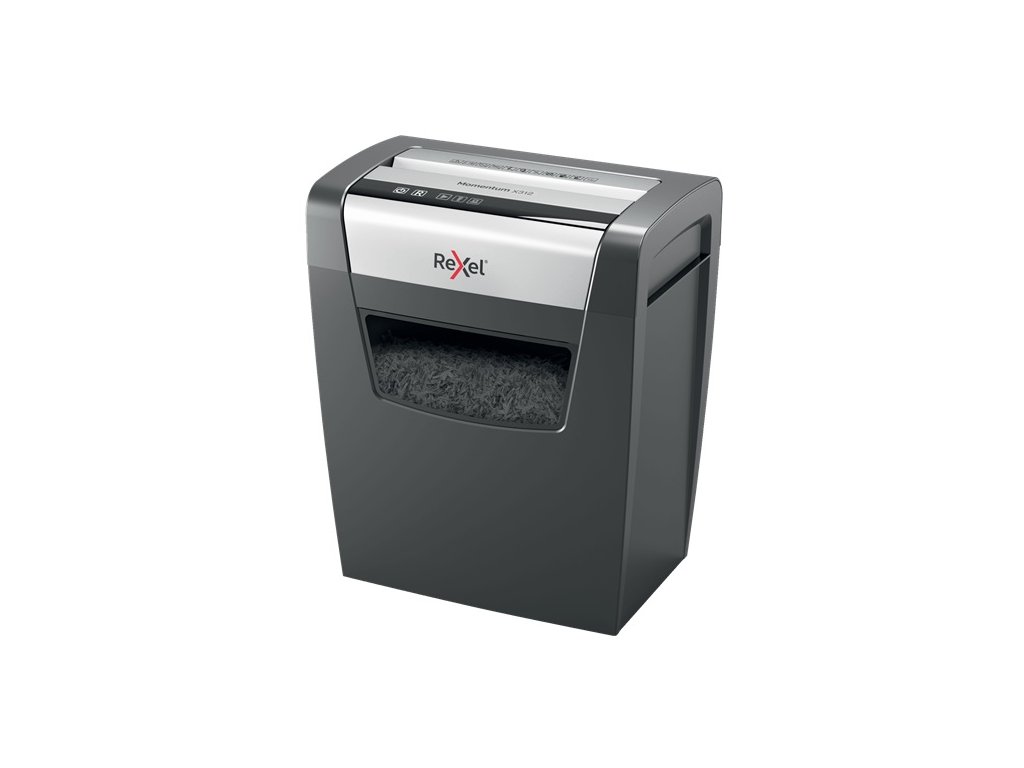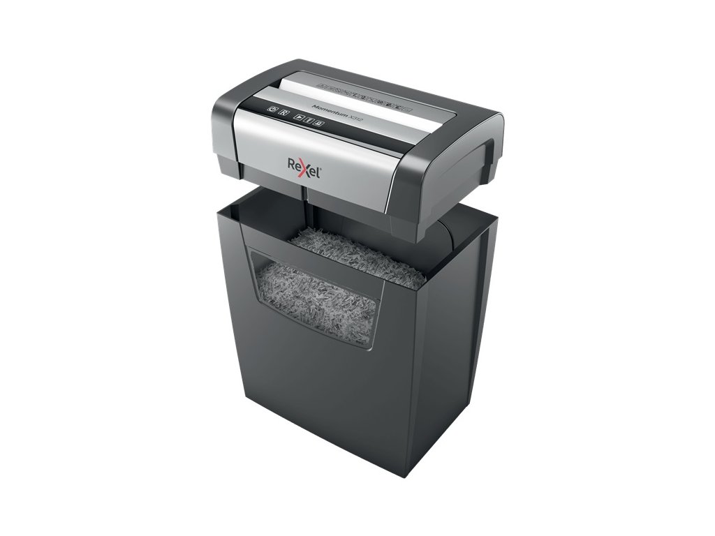 Nezastavitelná skartovacka! Rexel Momentum X312 skartuje až 12 listu najednou a vydrží v nepretržitém chodu 6 minut, vhodná pro použití doma. Technologie proti zaseknutí papíru garantuje neprerušované skartování. Krížový rez na úrovni zabezpecení P3 reže papír na cásti o velikosti 5x42 mm. Dotykové ovládání pro snadné a intuitivní ovládání. Objemný koš s kapacitou 23 l pojme 200 listu A4.