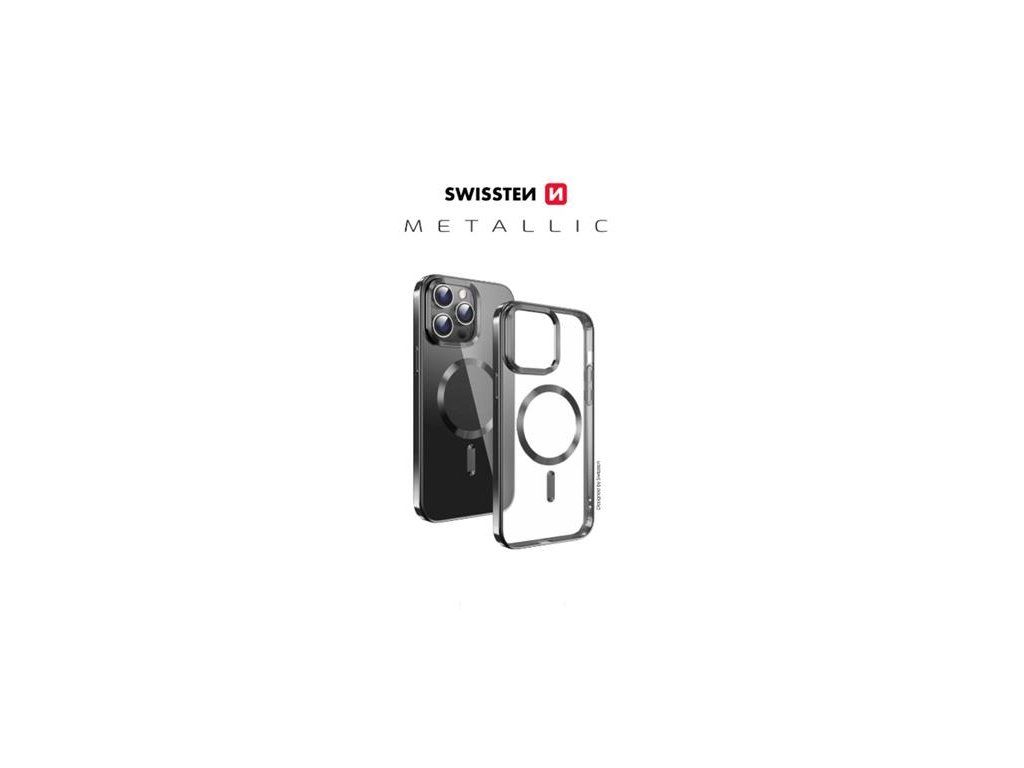 Luxusní čiré pouzdro SWISSTEN MagStick Metallic s elegantním černým rámečkem a metalickými doplňky. Vhodné pro dobíjení MagSafe. Baleno v blistru SWISSTEN