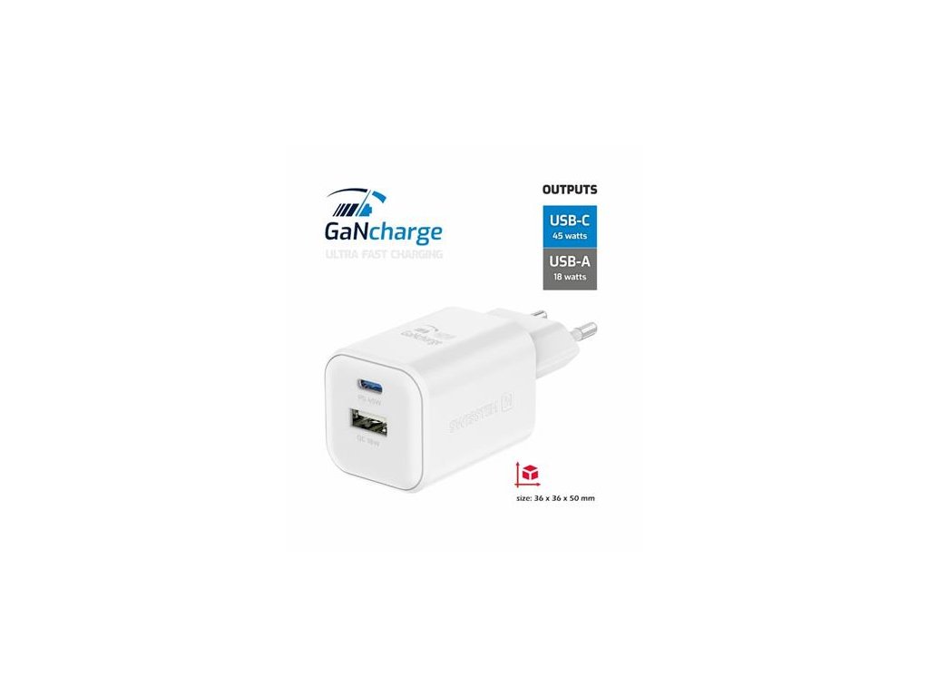 SWISSTEN SÍŤOVÝ ADAPTÉR GaN 1x USB-C 45W PD + 1x USB-A 18W QC BÍLÝ 22071300 Swissten
