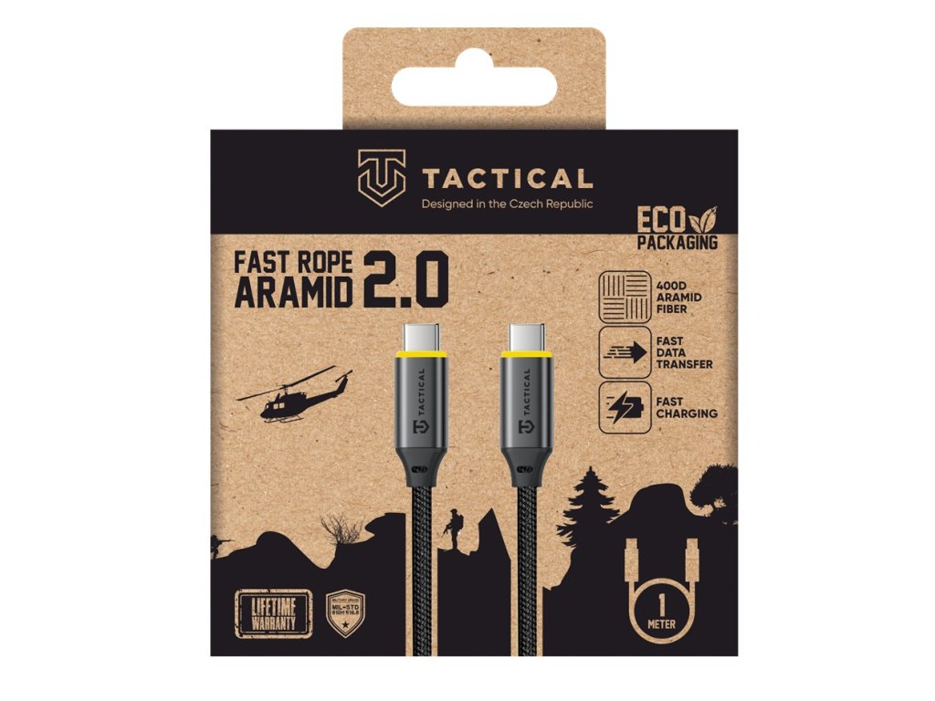 Tactical Fast Rope Aramid 2.0 Kabel USB-C/USB-C 1m Kabel s vysokou odolností pro každodenní použití, který nabízí rychlé 100W nabíjení a zvládne napájet telefon, tablet i notebook. Podporuje přenos dat až do rychlosti 10 Gb/s. Zesílený aramidovým vláknem, aby vydržel i ty nejnáročnější podmínky. Opletení z odolného nylonu zajišťuje maximální pevnost a dlouhou životnost. Fast Rope 2.0 je vybaven originálními konektory ze slitiny hliníku, které prodlužují životnost kabelu. Testováno dle MIL-STD. Specifikace: Výkon: 100W Přenosová rychlost: Až 10Gbps Materiál těla konektorů: Kov Norma MIL-STD-810H 516.8: Splněna Délka kabelu: 1 metr Značka: Tactical Záruka: ,2 roky ,  , ,