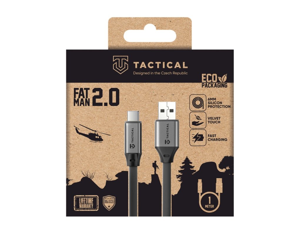 Tactical Fat Man 2.0 Kabel USB-A/USB-C 1m Šedá Tactical Fat Man 2.0 je rychlonabíjecí kabel pro každodenní použití s výkonem až 15W. Je určený k napájení telefonu, tabletu i notebooku a díky odolnému zesílení v podobě 6mm vrstvy silikonu zvládne i náročné zacházení. Kabel je osazen originálními konektory z hliníkové slitiny, které zajišťují pevné a stabilní připojení. Připraven do akce, otestován dle normy MIL-STD. Specifikace: Výkon: 15W Ochranná vrstva kabelu: 6mm Materiál ochranné vrstvy: Silikon Norma MIL-STD-810H 516.8: Splněna Značka: Tactical Záruka: ,2 roky