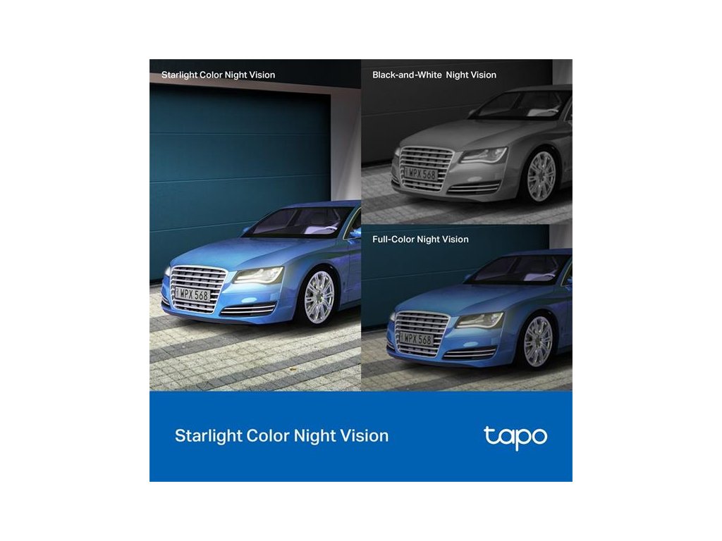 Farebné nočné videnie so snímačom Starlight - Kamera Tapo C520WS s objektívom s vysokou svetelnosťou F1,6 a snímačom Starlight zachytáva viac svetla a má vyššiu svetelnú citlivosť, takže za slabšieho osvetlenia vykresľuje jasnejšie farby ako farebné kamery s nočným videním osadené objektívom so svetelnosťou F2,2.