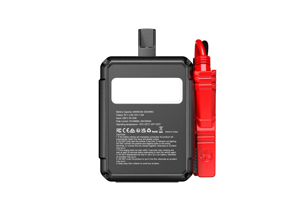 TOPDON V4000HD - profesionální 12V/24V startovací zdroj pro osobní a nákladní vozidla TOPDON V4000 HD je špičkový startovací zdroj navržený pro nestandartní podmínky. Tento profesionální model zvládá 12V i 24V systémy a je určen nejen pro osobní automobily, ale také pro nákladní vozy, autobusy, stavební techniku a těžká pracovní vozidla. Díky maximálnímu startovacímu proudu až 4000 A (12V) a 3000 A (24V) bez problémů nastartuje benzínové i dieselové motory až do objemu 16 litrů. Klíčové vlastnosti: •Vhodný pro osobní i těžká užitková vozidla (12V/24V) •Startovací výkon až 4000A (12V) a 3000A (24V) •Výkon pro velké motory do 16l (benzín i nafta) •Plné nabití za 3,5 hodiny přes USB-C port •12 V / 10 A DC výstup: pro příslušenství jako kompresor, chladnička, atd... •Provozní teploty –10 °C až +40 °C •7 ochranných systémů (proti zkratu, přepólování, přehřátí, přepětí a dalším rizikům) •Vestavěné LED osvětlení s trojím režimem (svítilna, SOS, stroboskop) Extrémní výkon bez kompromisů V4000 HD s bezpečnou LiFePO4 baterie s kapacitou 64 000 mAh (204,8 Wh). Ta poskytuje dostatek energie pro opakované starty – až 60 startů u 12V vozidel nebo 30 startů u 24V systémů na jedno nabití. Tento výkon z něj dělá ideální řešení pro autoservisy, odtahové služby i profesionální techniky v terénu. Maximální bezpečnost a spolehlivost Model V4000 HD je vybaven 7 inteligentními ochrannými systémy, které chrání zařízení i vozidlo před poškozením. Samozřejmostí je ochrana proti zkratu, přepólování, přehřátí, nadproudu, přepětí, hlubokému vybití i zpětnému nabíjení. Rychlé nabíjení a multifunkční využití Díky USB-C vstupu PD 65W lze jednotku plně dobít přibližně za 3,5 hodiny, takže je vždy rychle připravena k dalšímu použití. Kromě startování slouží V4000 HD také jako výkonná powerbanka s DC výstupem 12V / 10A nebo USB-A výstupem 5V / 2,4A. To umožňuje napájet nebo nabíjet další zařízení a příslušenství přímo v terénu. Nouzové osvětlení pro práci i krizové situace Vestavěné LED světlo se třemi režimy (svítilna / SOS / stroboskop) je ideální pro práci u vozidla v noci, signalizaci při poruše nebo nouzové situace na silnici či stavbě. Robustní konstrukce pro profesionální nasazení Pevné tělo a odolná konstrukce jsou navrženy pro každodenní používání v náročném prostředí. V4000 HD pracuje v teplotním rozsahu –10 °C až +50 °C, takže je spolehlivý v zimě i v horkých letních dnech. I přes svůj výkon si zachovává rozumné rozměry a hmotnost 4,0 kg, což umožňuje snadnou manipulaci. Obsah balení: •Jump Starter V4000 HD •Startovací kabely •USB-C/USB-C kabel •USB-A/USB-C kabel •Napájecí adaptér •Redukce k adaptéru •Uživatelská příručka Technické specifikace: Model: Jump Starter V4000HD Baterie Kapacita 204.8Wh/64000mAh Typ LiFePO4 Vstupy USB-C (PD) 65W max Výstupy DC 12V/10A (120W max.) USB-A 5V/2.4A (12 W max) Doplňující specifikace: Startovací proud: 4000A (12V), 3000A (24V) Maximální objem motoru pro start max. 16l pro dieslové motory, max. 16l pro benzínové motory Startovací kapacita: až 60x Pracovní teplota: od -10°C do 50°C Skladovací teplota: od -20°C do 70°C Certifikace CEFS, UKCA, ROHS Rozměry produktu 248x148x200mm Hmotnost 3976 g Další LED světlo stálé, stroboskop, SOS světlo Obrázky produktů jsou pouze informativního charakteru. Technické specifikace se mohou změnit bez výslovného upozornění.