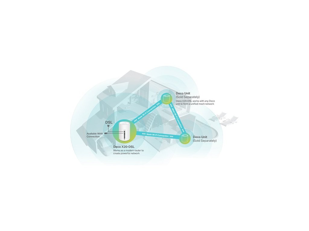 Deco X50-DSL je nejjednodušší způsob, jak zaručit silný signál Wi-Fi v každém rohu vašeho domova a zároveň připojit vaší síť k internetu pomocí DSL linky nebo klasický Gigabitový ethernet. Bezdrátové připojení a volitelné propojení jednotek buď kabelem či bezdrátově poskytují ještě vyšší síťovou rychlost a skutečně bezproblémové pokrytí. Chcete více pokrytí? Stačí přidat další jednotku Deco.