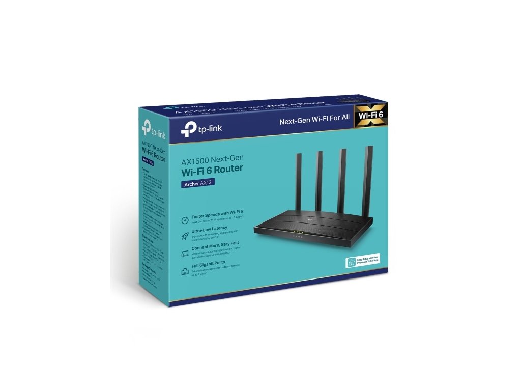 Router TP-Link Archer AX12 vám díky rozhraní AX1500 WiFi 6 zajistí kvalitní a rychlé připojení k internetu. Poskytne vám dvoupásmovou síť s rychlostí až 1201 v pásmu 5 GHz a 300 Mb/s při 2,4 GHz. K routeru zapojíte počítače, chytré televize, herní konzole a další podobná zařízení. Pustíte se do práce nebo si odpočinete u oblíbeného seriálu. Využijete k tomu Gigabitový širokopásmový přístup k internetu.
