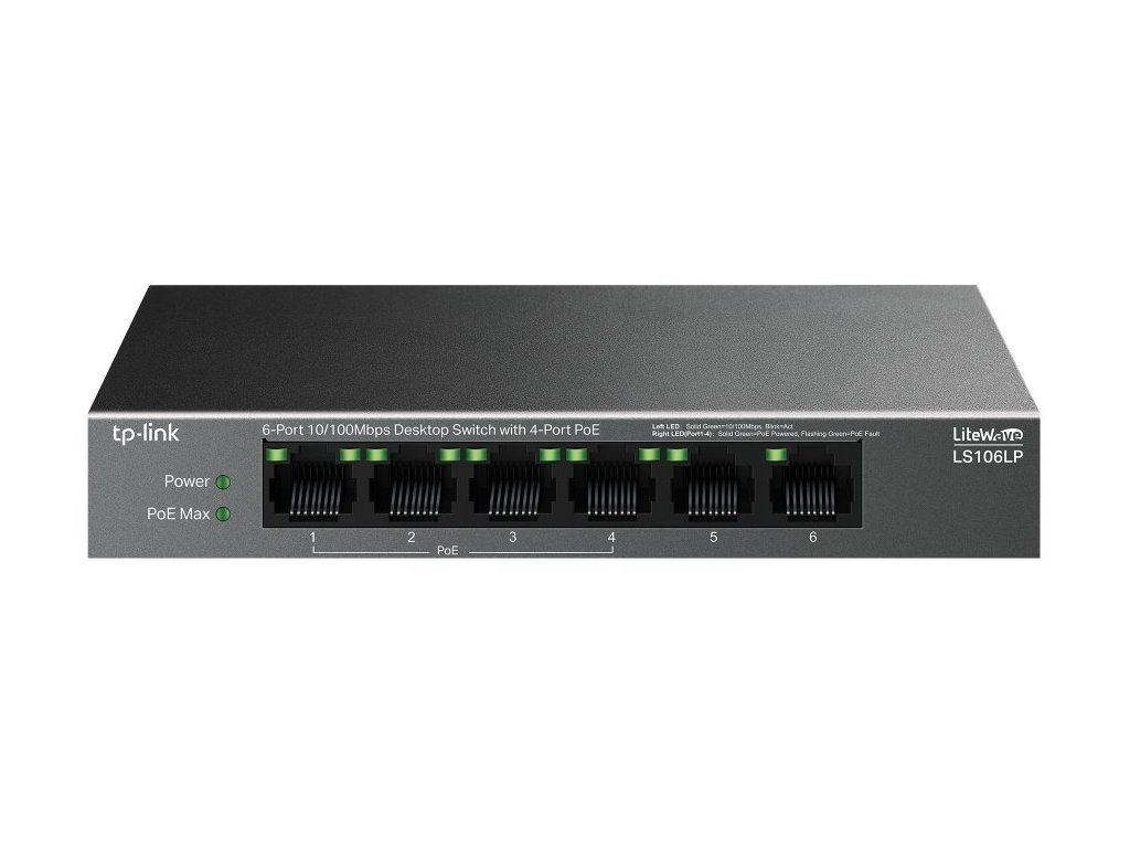 TP-Link PoE Switch LS106LP je nemanagovatelný PoE Switch s 6x 10/100Mbps LAN porty z čehož na 4 portech podporuje PoE 802.3af až 15,4W/port. Celkový PoE budget switche je 41W. Switch umožňuje i PoE na vzdálenost 250m při přepnutí speciálního přepínače, který způsobí ponížení linkové rychlosti na PoE portech na 10Mbps, což pro přenos obrazu z kamer bohatě stačí. Další funkcí je PoE auto recovery, která automaticky restartuje nereagující zařízení napájená pomocí PoE.