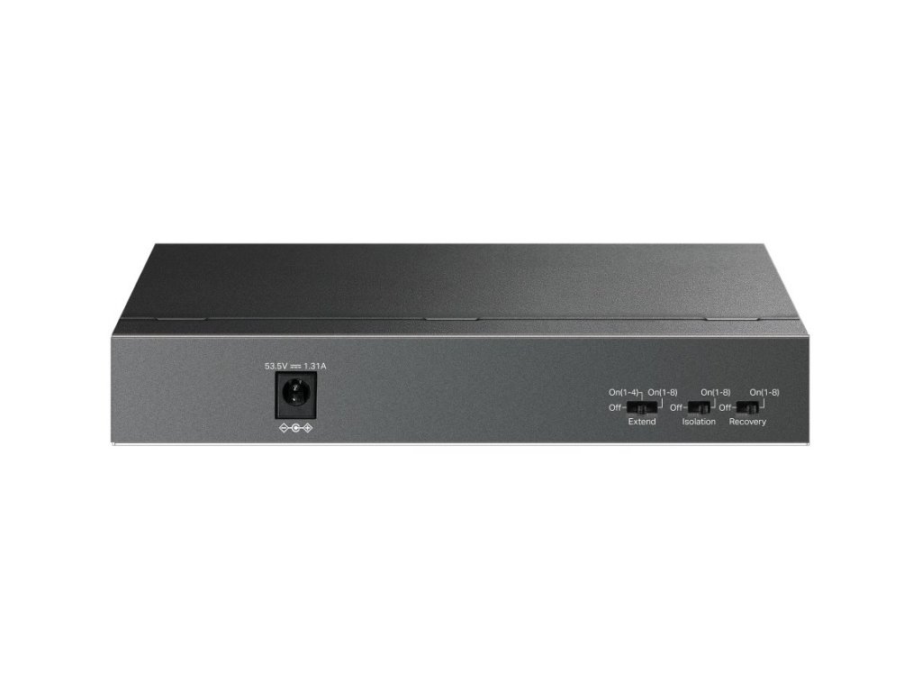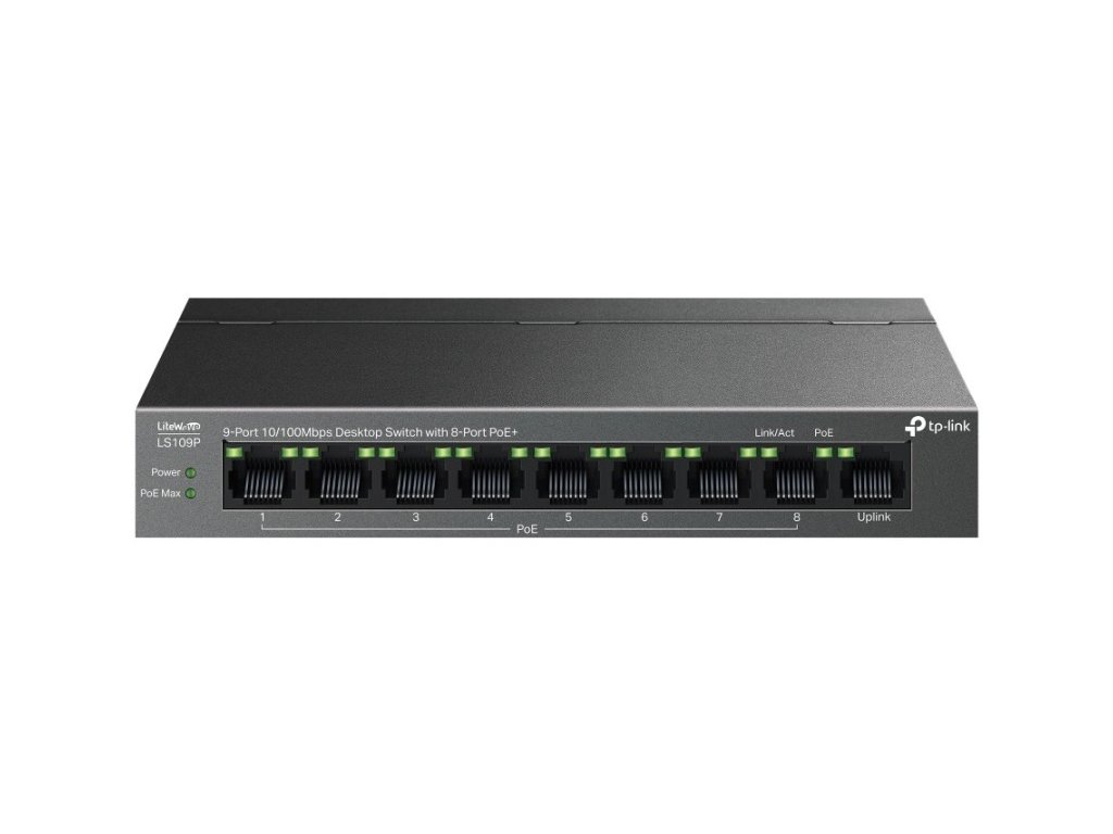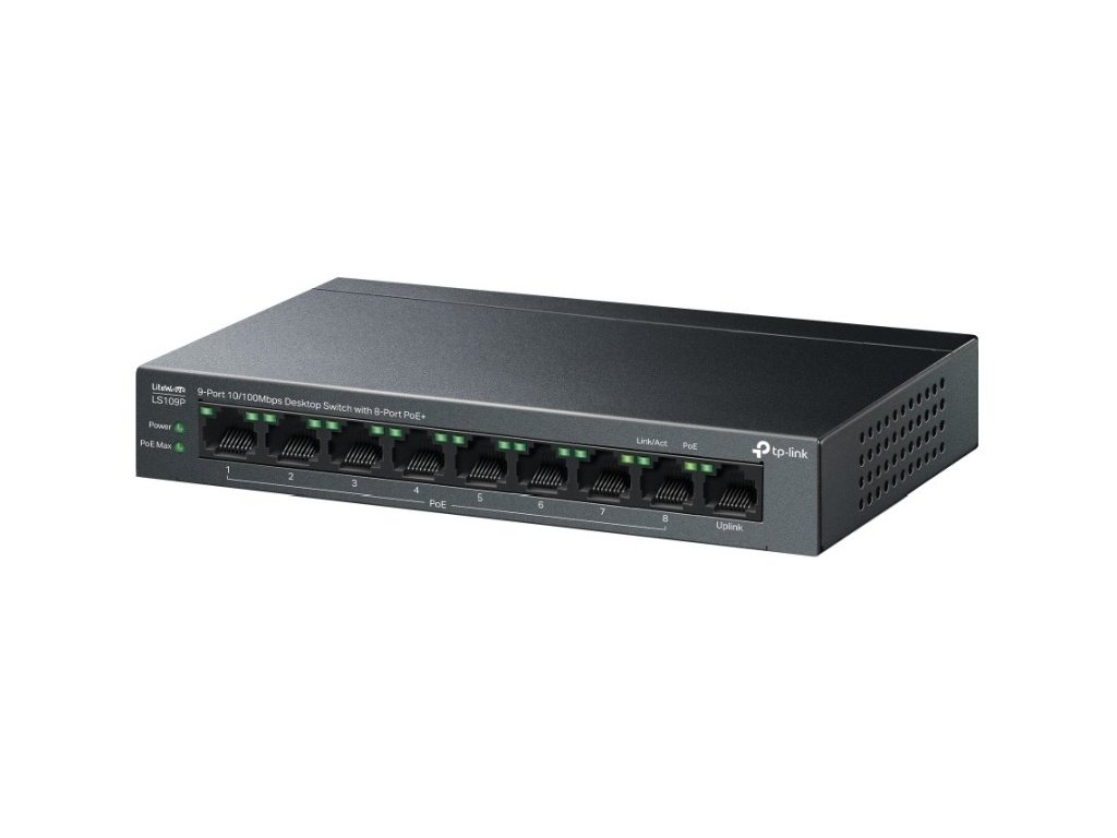 TP-Link PoE Switch LS109P je nemanagovatelný PoE Switch s 9x 10/100Mbps LAN porty z čehož na 8 portech podporuje PoE 802.3af/at až 30W/port. Celkový PoE budget switche je 63W. Switch umožňuje i PoE na vzdálenost 250m při přepnutí speciálního přepínače, který způsobí ponížení linkové rychlosti na PoE portech na 10Mbps, což je dostačující pro přenos obrazu z kamer. Další funkcí je PoE auto recovery, která automaticky restartuje nereagující zařízení napájená pomocí PoE nebo port isolation.