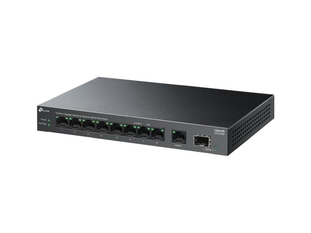 TP-Link PoE Switch LS1210GP je nemanagovatelný gigabitový PoE Switch s 9x 10/100/1000Mbps LAN porty a 1x SFP portem. Na 8 ethernetových portech podporuje PoE 802.3af/at až 30W/port. Celkový PoE budget switche je 61W. Switch umožňuje i PoE na vzdálenost 250m při přepnutí speciálního přepínače, který způsobí ponížení linkové rychlosti na PoE portech na 10Mbps, což je dostačující pro přenos obrazu z kamer. Další funkcí je PoE auto recovery, která automaticky restartuje nereagující zařízení napájená pomocí PoE nebo port isolation.
