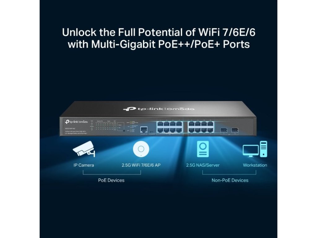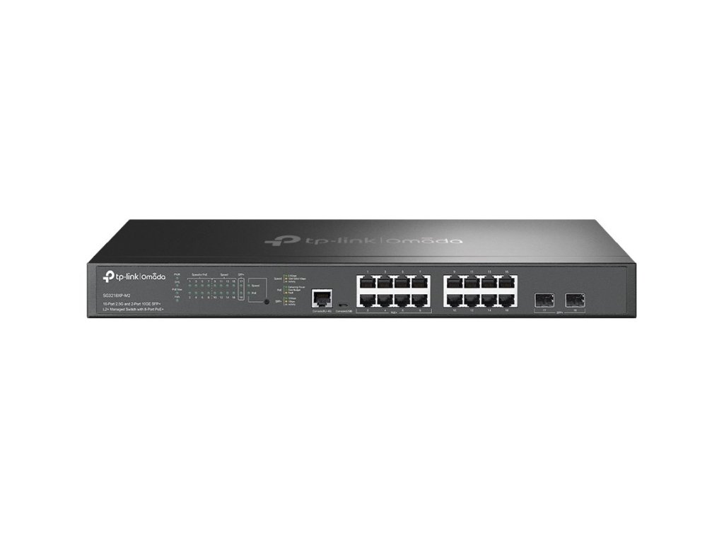 TP-Link SG3218XP-M2 je managovatelný L2+ PoE switch s 16x 2.5G LAN a 2x SFP+, který na 8 portech porporuje PoE-OUT 802.3af/at až 30W na port. Celkový PoE budget je 240W. Switch je možné spravovat přes webový management nebo Omada SDN centralizovaný cloud management.