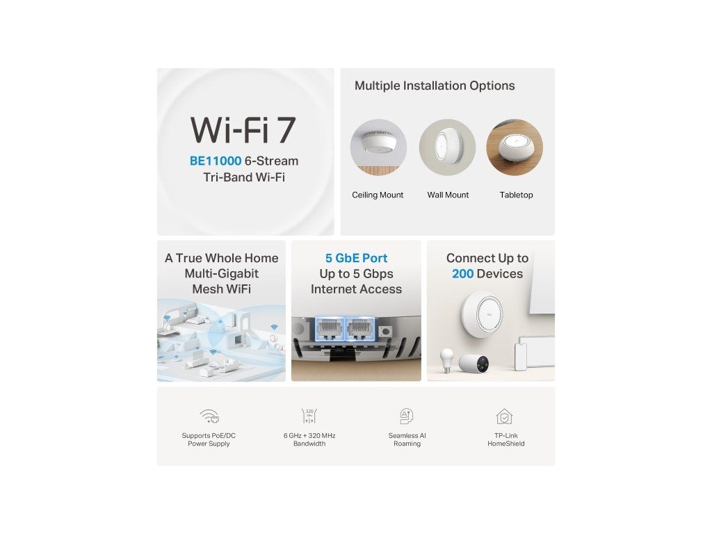 Deco BE65-PoE TP-Link Deco BE65-PoE přináší moderní Wi-Fi 7 s extrémní rychlostí až 5765 Mb/s v pásmu 6 GHz a možností napájení přes Ethernet (PoE). Ideální pro domácnosti i kanceláře, kde chcete vysokorychlostní, stabilní a inteligentně optimalizovanou síť s nízkou latencí. Bezdrátová síť * Standard: Wi-Fi 7 (IEEE 802.11be) * Tri-Band Wi-Fi BE9300: 6 GHz: až 5765 Mb/s, 5 GHz: až 2882 Mb/s, 2,4 GHz: až 688 Mb/s * Šířka kanálu: až 320 MHz (6 GHz) * Technologie: MLO, OFDMA, MU-MIMO, 4K-QAM, Multi-RUs * Pokrytí: AI Mesh – inteligentní síť optimalizovaná pro domácnost Výkon a kapacita * Multi-Link Operation (MLO): Současné odesílání a přijímání dat přes různé pásma a kanály * Kapacita sítě: Optimalizováno pro mnoho zařízení * AI-Driven Mesh: Inteligentní adaptace sítě dle prostředí Porty a hardware * Ethernet porty: 2× 5 Gb/s (PoE podpora) * Možnosti instalace: stolní, na strop, na stěnu s adaptérem Zabezpečení * TP-Link HomeShield: Ochrana sítě, rodičovská kontrola, IoT bezpečnost v reálném čase Software a správa * Správa: Deco App (iOS/Android), webové rozhraní (HTTP/HTTPS) Služby a porty: * Web Server: port 80/443 TCP * DNS: port 53 TCP/UDP * DHCP Server: port 67 UDP * App Management: porty 22, 20001, 30001 TCP, 20002 UDP Provozní podmínky * Provozní teplota: 0 °C až 40 °C * Skladovací teplota: -40 °C až 60 °C * Provozní vlhkost: 10 % až 90 % RH * Skladovací vlhkost: 5 % až 90 % RH Obsah balení * 1× Deco BE65-PoE jednotka * 1× RJ45 Ethernet kabel * 1× napájecí adaptér (pokud PoE není použito) * Stručný instalační návod Odkaz na web výrobce: https://www.tp-link.com/cz/home-networking/deco/deco-be65-poe/