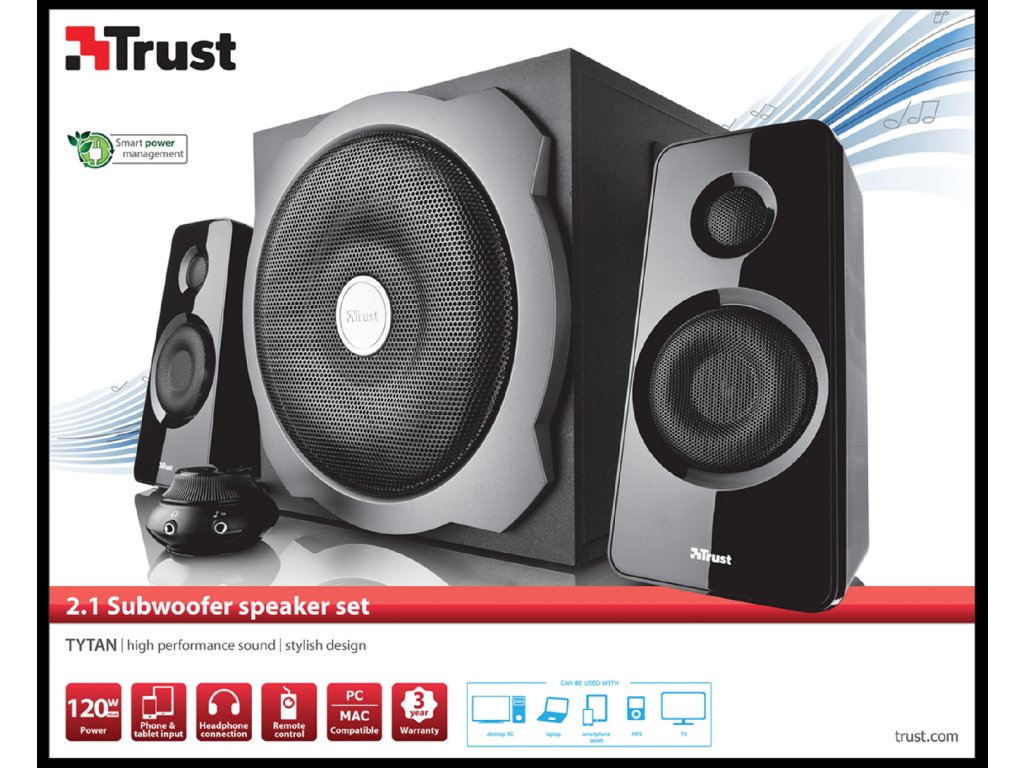 Sestava 2.1 reproduktorů s dřevěným subwooferem a úhrnným výkonem 60 W RMS (maximální výkon 120 wattů) * Sestava 2.1 reproduktorů s dřevěným subwooferem a úhrnným výkonem 60 W RMS (maximální výkon 120 wattů) * Vysoce kvalitní zvuk s hlubokým basem * Praktické drátové ovládání hlasitosti pro připojená sluchátka nebo přehrávač iPod/mp3 * Postranní ovládání hlasitosti a basů Rozměry a hmotnost * Rozměry subwoofer: 25 x 25 x 25 cm * Rozměry satelity: 20 x 10 x 10 cm * Hmotnost 4.9 kg Obsah balení: * Reproduktory s kabely * Subwoofer s napájecím kabelem * Dálkové ovládání s kabelem * Uživatelská příručka Systémové požadavky: * 3.5 mm audio konektor * Připojení do elektrické zásuvky Více na webu výrobce: http://www.trust.com/en/product/19019-tytan-2-1-subwoofer-speaker-set-black