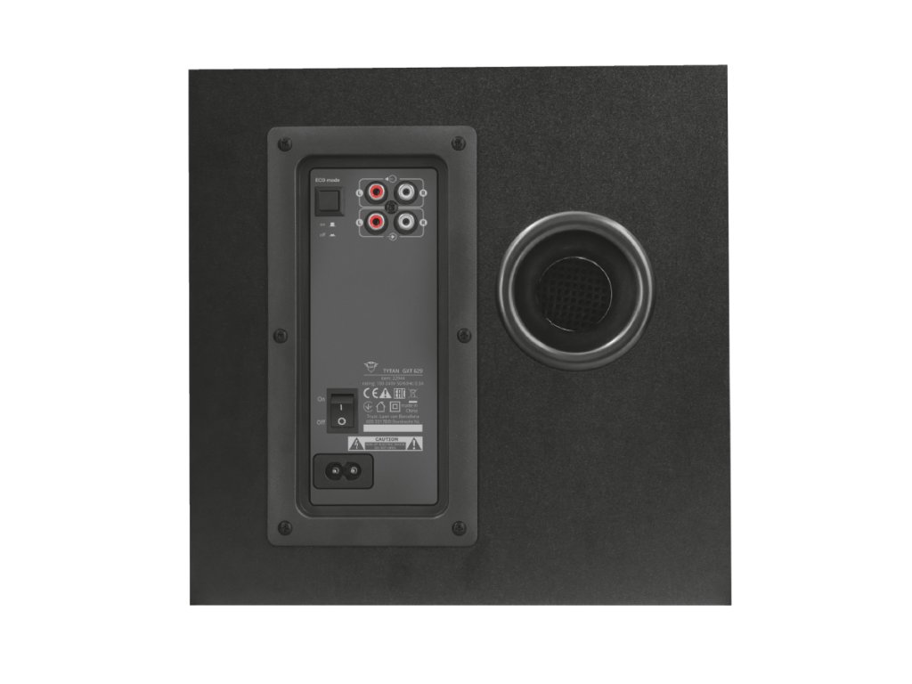 -120W špičkový výkon (60 W RMS) -Pro PC, notebook, televizi, smartphone a tablet -Dřevěný subwoofer pro bohatý a výkonný zvuk -Přednastavené světelné režimy: 7 barev synchronizovaných na basu, RGB dýchání, rotační RGB, synchronizované RGB -Včetně bezdrátového dálkového ovladače pro ovládání napájení, hlasitosti, basů a světel -Inteligentní řízení spotřeby: při nepoužívání se přepne do pohotovostního režimu -Typ zapojení: 3,5mm -Výstup: 120W -Výstup (RMS): 60W -Frekvenční rozsah: 20 - 20000 Hz -Impedance: 4 Ohm -Hmotnost: 4240g -Odpojitelný napájecí kabel -Dálkové ovládání Odkaz na stránky výrobce https://www.trust.com/en/product/22944-gxt-629-tytan-2-1-rgb-speaker-set