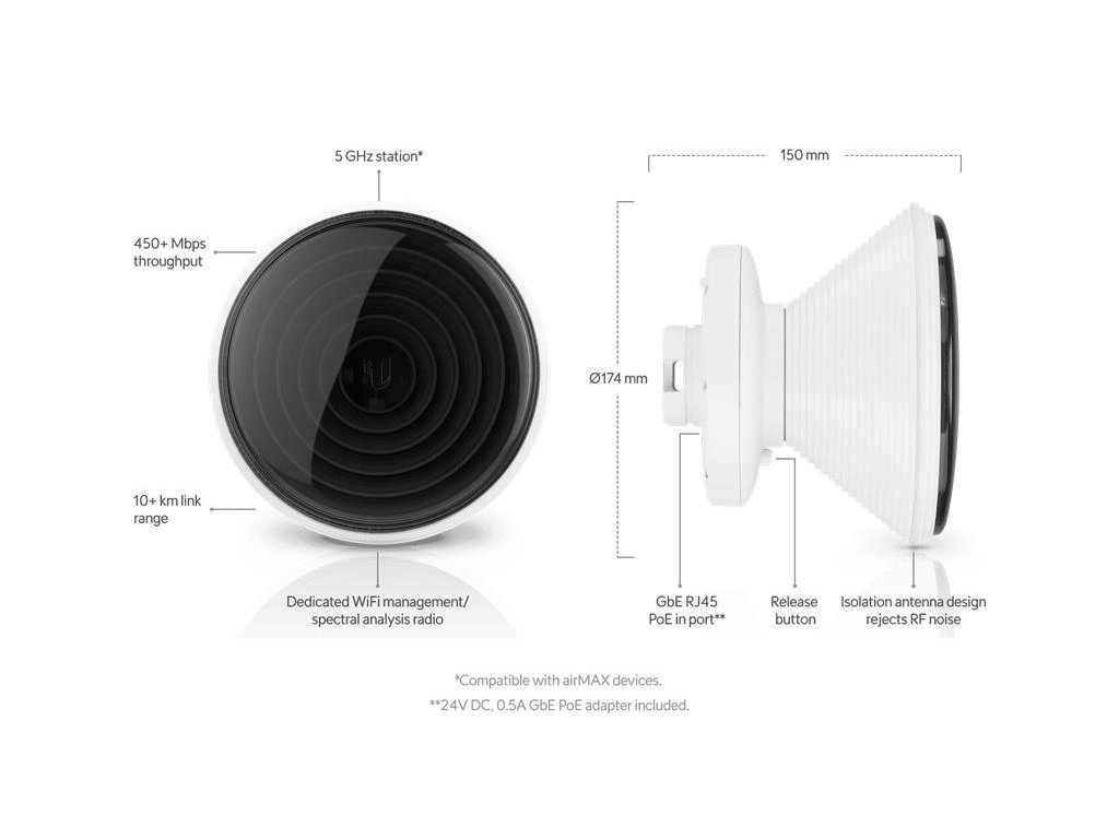 Compact, UISP-ready, 5 GHz WiFi bridge with enhanced surge protection and an interchangeable horn antenna.
