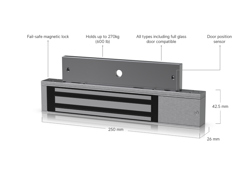 *Zabezpečení Fail-Safe: Zámek funguje na principu ''při výpadku proudu odemčeno'', což je kritický prvek pro zajištění bezpečného úniku osob z budovy při požáru nebo nouzových situacích. *Vysoká přídržná síla: Extrémně silný elektromagnet udrží dveře bezpečně uzavřené proti tlaku několika set kilogramů, což efektivně brání násilnému vniknutí. *Bezmechanický design: Absence pohyblivých částí minimalizuje opotřebení a hlučnost zámku, což jej činí ideálním pro kanceláře, školy a komerční prostory. *Plná UniFi integrace: Snadné zapojení do UniFi Access Hubu (UA-Hub) umožňuje vzdálenou správu, nastavení časových rozvrhů a okamžitý monitoring stavu dveří.Specifikace