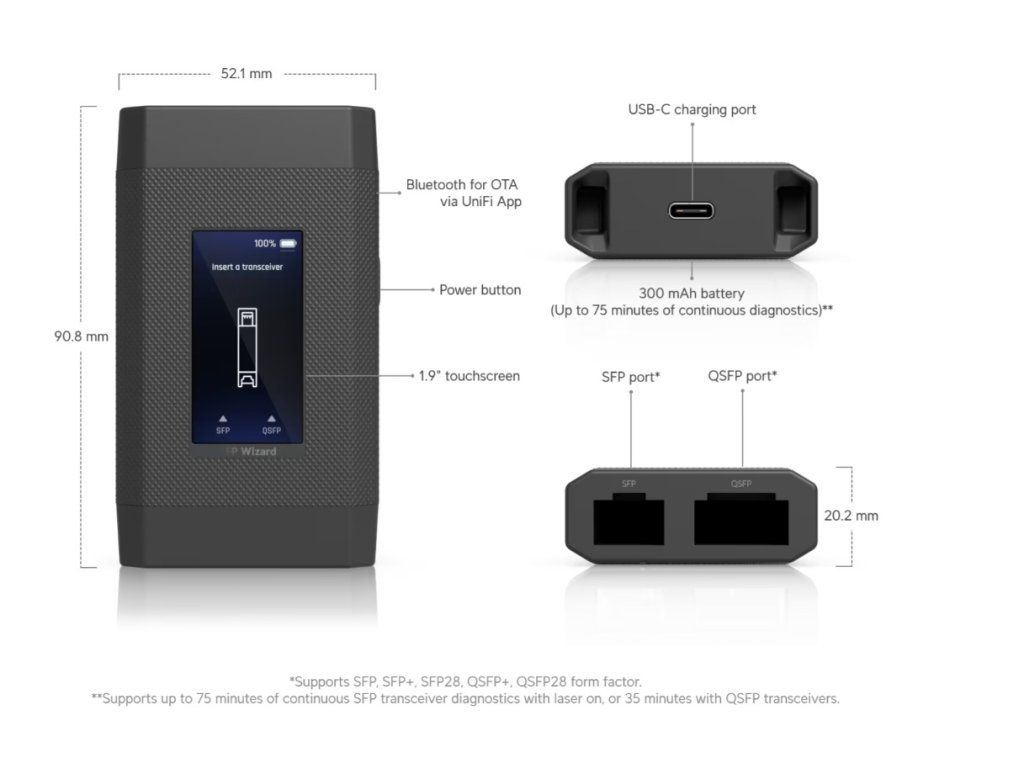 Ubiquiti UACC-SFP-Wizard Kompaktní nástroj pro okamžité přeprogramování, testování a odemknutí univerzální kompatibility optických modulů. Umožňuje plnou diagnostiku SFP/QSFP modulů včetně OTA aktualizací a detailního zobrazení stavu přímo na vestavěném displeji. Mechanické provedení *Rozměry: 90,8 × 52,1 × 20,2 mm *Hmotnost: 84 g *Materiál krytu: Polykarbonát Hardware *Síťové rozhraní: BLE (Bluetooth Low Energy) *Napájení: Li-ion baterie *Výdrž baterie: až 75 minut kontinuální diagnostiky SFP modulů (laser zapnutý) nebo až 35 minut při použití QSFP modulů *Typ baterie: Dobíjecí Li-ion, 3,7 V DC, 300 mAh *Podporované napětí (nabíjení): USB-C 5 V DC / 0,5 A *Maximální spotřeba: 0,6 W *Podporované formáty modulů: SFP, SFP+, SFP28, QSFP+, QSFP28 *Displej: 1,9'' dotykový LCM *Tlačítka: 1× napájení *Provozní teplota: 0 až 40 °C *Provozní vlhkost: 10 až 90 % (nekondenzující) *Certifikace: FCC, IC, CE NDAA compliant: Ano Podporované mobilní aplikace *UniFi iOS verze 10.29.1 a novější *UniFi Android verze 10.30.2 a novější Web výrobce: https://techspecs.ui.com/unifi/accessories/uacc-sfp-wizard