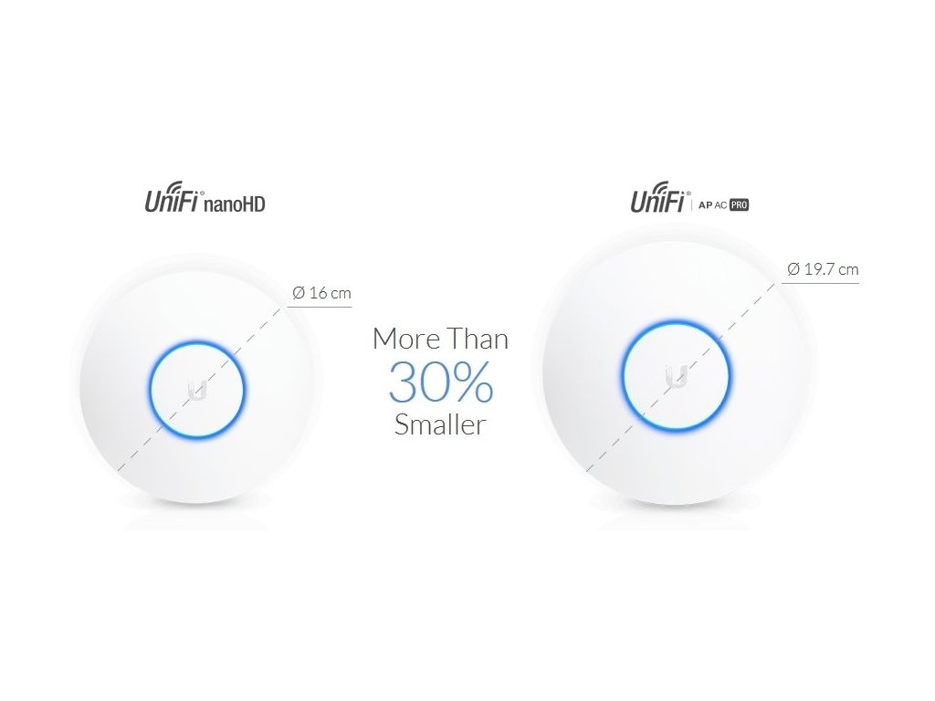 Popis produktu Zařízení je součástí kompletní řady výrobků UniFi, podporuje standardy 802.11a/g/b/n/ac/ac-wave2, kdy používá jak pásmo 2,4GHz, tak i 5GHz a to s modulačními rychlostmi 300Mbps a 1733Mbps. K podpoření výkonu bezdrátové části je UAP vybaveno jedním Gigabit ethernetovým portem, který je kompatibilní s PoE standardem 802.3af. Maximální výkon 2,4GHz rádiové části je 23dBm a 26dBm v pásmu 5GHz. Šifrování pomocí WPA2 je dnes již samozřejmostí. Výhody MU-MIMO technologie Díky MU-MIMO (MultipleUser - Multiple In - Multiple Out) technologii je UAP-nanoHD schopno komunikovat s několika zařízeními ve stejný čas: 4 klienti 1x1 2 klienti 2x2 1 klient 2x2 + 2 klienti 1x1 1 klient 3x3 + 1 klient 1x1 Volitelné šasi Jako první z rodiny UniFi bude mít tento model volitelné šasi, které bude možné dokoupit a bude na výběr z celkem 6ti různých vzorů - mramor, matná černá, beton, dřevo, tkanina a vojenské maskování. Velmi malé rozměry UAP-nanoHD je nejmenší přístupový bod UniFi. Je o 30% menší než verze UAP AC Pro a přibližně stejně veliký jako UAP-AC-Lite. Komplexní řídící SW pro všechny produkty UniFi K zařízení je potřeba stáhnout z oficiálních stránek originální software nazývaný UniFi Network application, díky kterému lze řídit celou síť. Nespornou výhodou UniFi Network application je, že je zcela zdarma bez jakéhokoliv omezení! Tento centrální management umožní nahrávat mapy a nastavit základní parametry jako například SSID, guest účet, úvodní stránku, statistiky provozu i seznam a status asociovaných klientů vždy snadno a rychle. Výhody UniFi řešení * Zero Handoff Roaming - bezvýpadkový přechod mezi jednotlivými AP * Wireless uplink (hodí se tam, kam není možné dostat datový kabel) * až 4 SSID * detailní statistiky provozu * Guest síť * Voucher system * Load balance - udržování rovnoměrné zátěže/přepínání klientů * omezování rychlosti pro každé SSID Obsah balení * (3) zařízení * (3) montážní úchyty na strop a zeď * (3) sada šroubků a hmoždinek Technické parametry Bezdrátové vlastnosti Bezdrátové frekvence: 2,4 + 5GHz (dual band) Přenosová rychlost WiFi - 2,4GHz [Mb/s]: 300 Přenosová rychlost WiFi - 5GHz [Mb/s]: 1733 WiFi standardy: 802.11ac, 802.11n, 802.11a,802.11b/g Vysílací výkon 2,4GHz [dBm]: 23 Vysílací výkon 5GHz [dBm]: 26 Šifrování: WEP, WPA, WPA2 2,4GHz MIMO: 2x2 5GHz MIMO: 4x4 Typ antény: Vestavěná Počet vestavěných antén: 4 Zisk antény [dBi]: 3 Fyzické charakteristiky Použití: Vnitřní Tlačítka: Reset Provozní teplota [°C]: -10 až 70 Hmotnost [g]: 300 Hloubka [mm]: 160 Šířka [mm]: 160 Výška [mm]: 33 Konektory a rozhraní Rychlosti LAN: (1) 10/100/1000Mbps Gigabit LAN: Ano Napájení Max. spotřeba energie [W]: 10,5 Napájení přes PoE: 802.3af, 48V DC Typy PoE: Vstupní Software Operační mód: Access Point Podpora IPv6: Transparentní (režim bridge) Výchozí IP adresa: Dynamická z DHCP Výchozí jméno a heslo: Ubiquiti/Ubiquiti