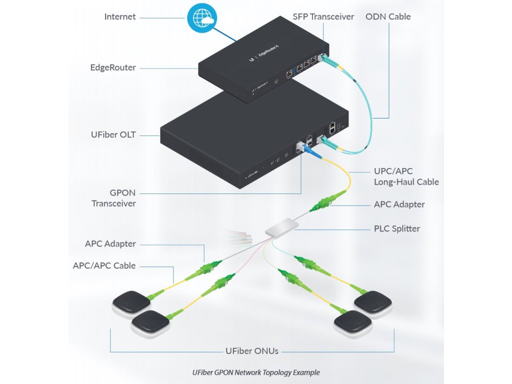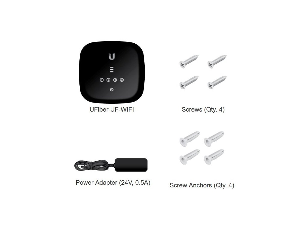 Popis produktu UF-WIFI je robustní, vysoce výkonná GPON klientská jednotka ONT s funkcí routeru (funkce routeru bude podporována v budoucí verzi firmware), čtyřmi Gbit ethernety a 300Mbps WiFi rozhraním. Napájení Napájí se prostřednictvím pasivního PoE nebo adaptérem s DC konektorem s napětím 24V. Maximální spotřeba zařízení je 7W. Kompatibilita třetích stran K jednomu portu GPON lze připojit až 128 zařízení WiFi UFiber a to až na vzdálenost 20km. UFiber WiFi lze použít jak s UFiber OLT od Ubiquiti, tak i s OLT zařízeními třetích stran. Obsah balení * zařízení * napájecí adaptér 24V/0,5A * příchytový materiál Technické parametry Bezdrátové vlastnosti Přenosová rychlost WiFi - 2,4GHz [Mb/s]: 300 2,4GHz MIMO: 2x2 Typ antény: Vestavěná Počet vestavěných antén: 2 Fyzické charakteristiky Tlačítka: Reset Provozní teplota [°C]: -10 až 45 Hmotnost [g]: 190 Hloubka [mm]: 126 Šířka [mm]: 126 Výška [mm]: 32 Konektory a rozhraní Optické konektory: (1) SC Rychlosti LAN: (4) 10/100/1000Mbps Gigabit LAN: Ano Napájení Napájení přes PoE: 24V DC Max. spotřeba energie [W]: 7 Napájení přes konektor/svorkovnici: 20 .. 28VDC Optika Typ broušení: APC Vysílací výkon [dBm]: 1,5 až 5 Přijímací citlivost [dBm]: -8 až -28 Software Výchozí IP adresa: 192.168.1.1 Výchozí jméno a heslo: Ubiquiti/Ubiquiti