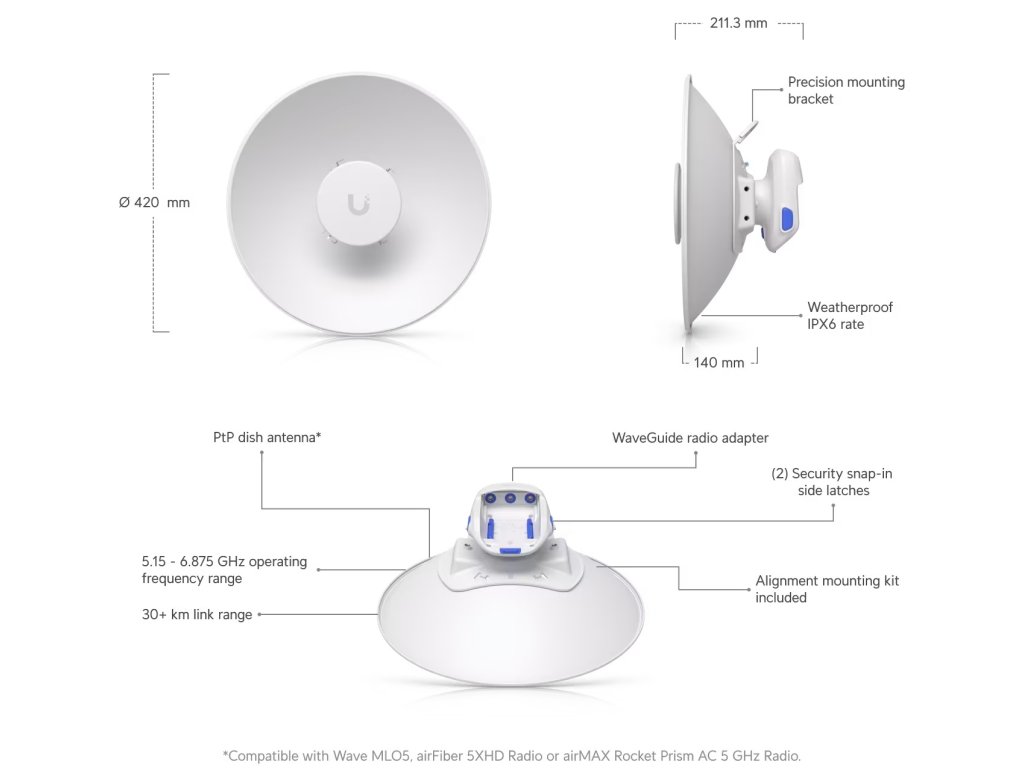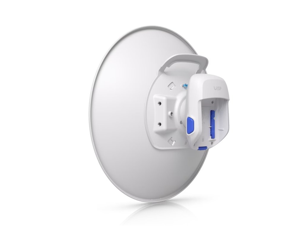 Ubiquiti UISP Dish Mini Technické specifikace Rozměry: * Anténní talíř: 420 x 140 mm * Anténní talíř s vlnovodem: 420 x 211,3 mm Hmotnost: * Anténní talíř: 1,95 kg * Držák: 1 kg * Vlnovod: 0,45 kg Materiál pouzdra: * Anténní talíř: Práškově lakovaná pozinkovaná ocel, UV stabilizovaný polykarbonát * Vlnovod: Hliníková slitina, UV stabilizovaný polykarbonát Materiál držáku: Práškově lakovaná pozinkovaná ocel, hliníková slitina Odolnost proti větru: Až 200 km/h Zatížení větrem: 348 N při 200 km/h Montáž: * Montáž na sloup * Montážní sada pro zarovnání * Mechanické seřízení: cca 20° elevace Průměr montáže na sloup: 32–76 mm Odolnost proti povětrnostním vlivům: IPX6 Hardware Frekvenční rozsah: 5,15 až 6,875 GHz Zisk: 26 dBi Šířka paprsku: * Azimut: 5,8 až 9° (3 dB) / 7,6 až 12,5° (6 dB) * Elevace: 5,8 až 9° (3 dB) / 7,6 až 12,5° (6 dB) Elektrický náklon dolů: 0° Max. VSWR: 2:1 Polarizace: Duálně lineární Izolace Cross-Pol: 15 dB V souladu s NDAA: Ano