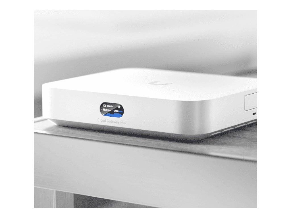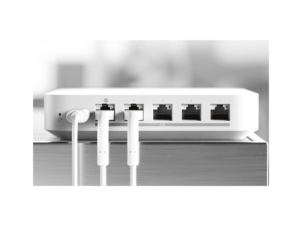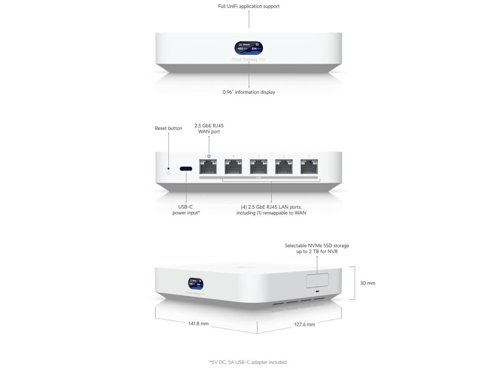 Compact 2.5G Cloud Gateway with 30+ UniFi device / 300+ client support, 1.5 Gbps IPS routing, and selectable NVR storage.