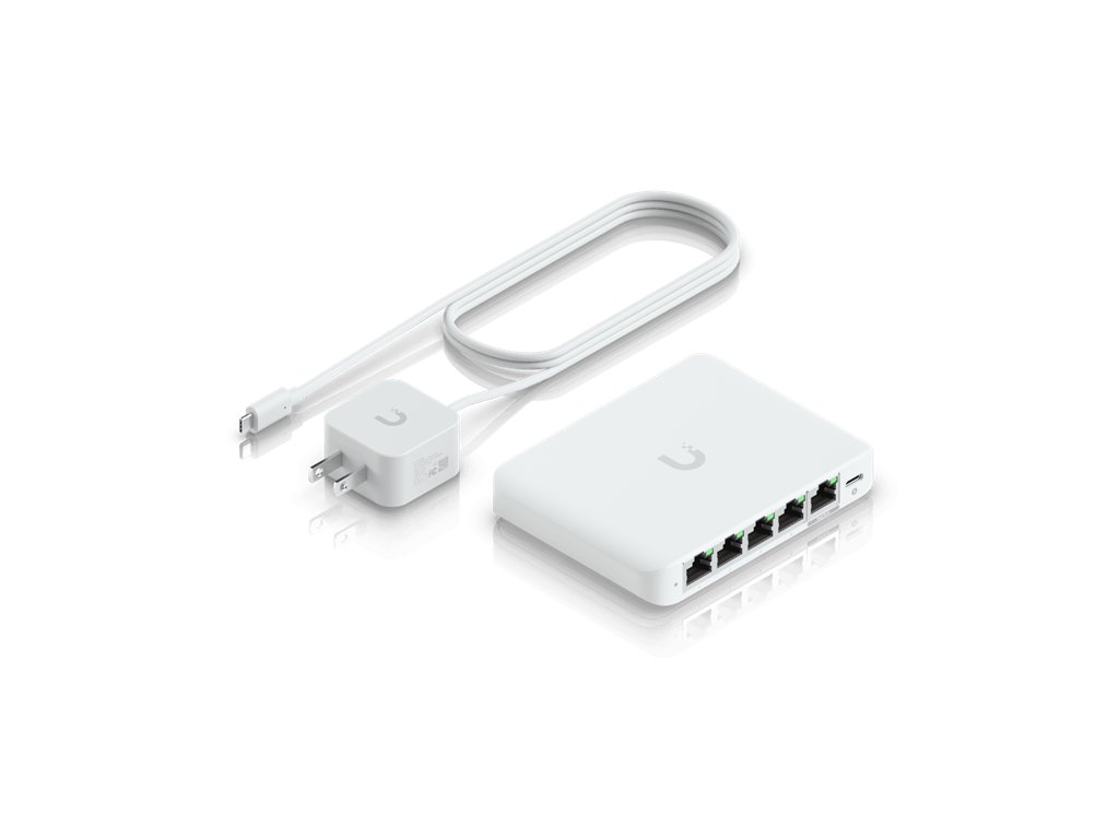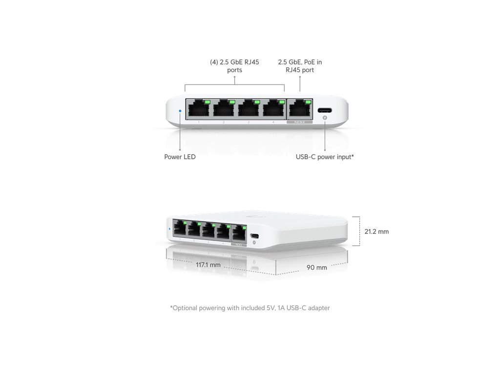 kompaktní 5-port 2.5 GbE switch s ožností napájení přes POE nebo USB-C napájecím adaptérem (součástí balení)