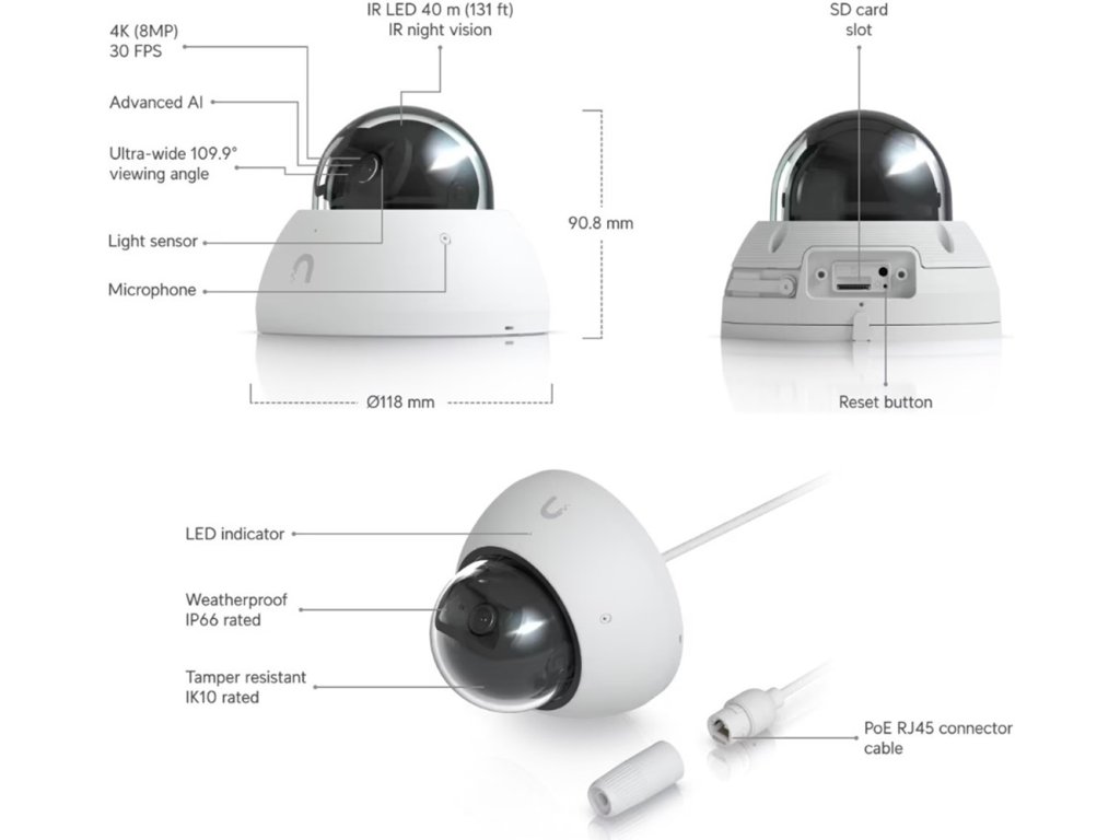 Ubiquiti UniFi AI Dome Venkovní 4K PoE Dome kamera s pokročilou AI pro rozpoznávání osob a registračních značek, s dlouhým dosahem nočního IR vidění a ochranou vůči nepříznivému počasí. Kamera snímá 8 Mpx video (3840 x 2160) při 30 snímcích za sekundu s fixním 2,8mm objektivem. Klíčové vlastnosti *4K (8 MP) rozlišení *Úhel záběru - 109.9° horizontálně, 134.1° diagonálně, 56.7° vertikálně *Vestavěné IR LED diody a automatický IR cut filtr pro lepší noční vidění (40m) *Voděodolnost IP66 + odolnost IK10 (antivandal) *Napájení přes PoE (42,5-57V DC) *Podpora karet MicroSD (minimálně 64 GB) Technické parametry Kamera - optika Typ objektivu: fixní Objektiv [mm]: 2,8 (fixní) Přísvit: IR Dosah přísvitu [m]: 40 Pozorovací úhel [°]: horizontálně 109,9 (V: 56,7, D: 134,1) Režim den/noc: vestavěné IR LED osvětlení a IR cut filtr Obrazový senzor ['']: 1/1,8 (8MP) Objektiv: pevná ohnisková vzdálenost Obraz Rozlišení: 8MP Max. rozlišení [pixely]: 3840x2160 (16:9) Max. snímková frekvence: 30 FPS Nastavení obrazu: barva, jas, ostrost, kontrast, vyvážení bílé, ovládání expozice, 2DNR, 3DNR, NR pohybem, maskování, textové překrytí, HDR LED diody: R/G/B/W Systém Procesor: čtyřjádrový čip na bázi Arm Cortex-A53 Síťové rozhraní: port GbE RJ-45 Konektory a rozhraní Audio: *mikrofon (lze vypnout) *reproduktor: ne Slot na paměťové karty: microSD Napájení Napájení přes PoE: rozsah napětí 42,5–57V DC Typ napájení: PoE Max. spotřeba energie [W]: 10 Fyzické charakteristiky Stupeň krytí: IP66 Použití: venkovní Antivandal (ochrana proti nárazu): IK10 Provozní teplota [°C]: -30 až 50 Provozní vlhkost: 10 až 90 % bez kondenzace Hmotnost [g]: 700 Šířka [mm]: 118 Výška [mm]: 90,8 Hloubka [mm]: 118 Barva: bílá Délka kabelu [mm]:300 Průměr kabelu [mm]: 4,5 Typ konektoru kabelu: RJ-45 Montáž: stropní, ramenní, nástěnná, závěsná, rozvodná skříň Software Webovská aplikace: UniFi Protect Mobilní aplikace: UniFi Protect iOS a Android Výchozí IP adresa: 192.168.1.20, dynamická z DHCP Výchozí jméno a heslo: Ubiquiti/Ubiquiti Obsah balení *zařízení *montážní sada k přichycení na zeď či strop