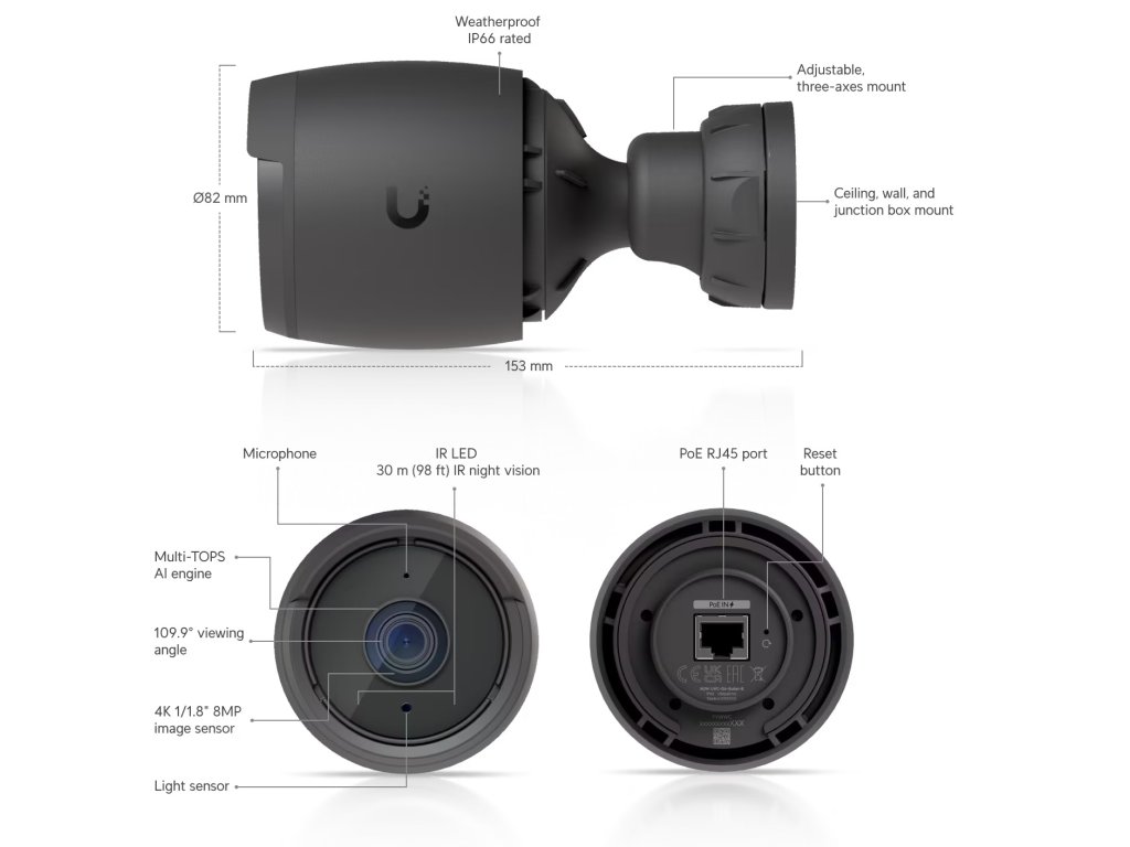 UniFi Protect G6 Bullet Technické specifikace Rozměry: * Bez držáku: 82 x 88,8 mm * S držákem: 82 x 153 mm IR noční vidění: 30 m Rozpoznávání tváře: Ano Rozpoznávání registračních značek: Ano Chytrá detekce (lidé, vozidla, zvířata): Ano Rozlišení: 4K Zorné pole: H: 109,9°, V: 56,7°, D: 134,1° Audio: Mikrofon Odolnost vůči povětrnostním vlivům: IP66 Odolnost proti neoprávněné manipulaci: IK04 Montáž: Montáž na stěnu, strop, sloup Výkon Síťové rozhraní: 10/100 MbE RJ45 port Video: * Nastavení obrazu: Barva, jas, ostrost, kontrast, vyvážení bílé, ovládání expozice, 2DNR, 3DNR, NR podle pohybu, maskování, překrytí textu, HDR * Max. Snímková frekvence: 30 FPS * Rozlišení: 8MP 3840 x 2160 (16:9) Optika: * Senzor: 1/1,8'' 8MP * Čočka: Pevná ohnisková vzdálenost * Noční režim: Vestavěné IR LED osvětlení a IR filtr Hardware Max. Spotřeba energie: 9,9W Podporovaný rozsah napětí: 37–57 V DC Metoda napájení: PoE Procesor: Čtyřjádrový čip založený na Arm® Cortex®-A53 Průměr pro montáž na sloup: 38–50 mm Hmotnost: * Bez držáku: 587 g * S držákem: 737 g Materiál krytu: Polykarbonát, hliníková slitina Materiál uchycení: * Nástěnná montáž: hliníková slitina, polykarbonát * Sloupová montáž: hliníková slitina Tlačítko: Obnovení továrního nastavení Okolní provozní teplota: -20 až 50 °C Okolní provozní vlhkost: 0 až 90 % nekondenzující Certifikace: CE, FCC, IC Splňuje požadavky NDAA: Ano