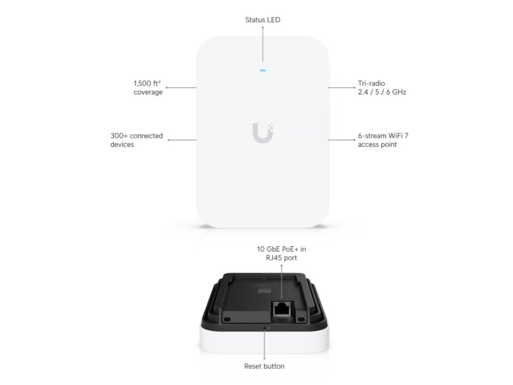 Ubiquiti U7-Pro-XG-Wall Nástěnný Wi-Fi 7 access point s podporou 6 GHz Přehled *Rozměry: 155 × 108 × 33,5 mm *Wi-Fi standard: Wi-Fi 7 (802.11be) *Počet prostorových streamů: 6 *Pokrytí: až 140 m2 *Max. počet klientů: 300+ *Uplink: 10 GbE *Montáž: na zeď *Napájení: PoE+ Výkon *MIMO 6 GHz: 2×2 DL/UL MU-MIMO *MIMO 5 GHz: 2×2 DL/UL MU-MIMO *MIMO 2,4 GHz: 2×2 DL/UL MU-MIMO *Max. datová rychlost 6 GHz: 5,8 Gb/s (BW 320 MHz) *Max. datová rychlost 5 GHz: 4,3 Gb/s (BW 240 MHz) *Max. datová rychlost 2,4 GHz: 688 Mb/s (BW 40 MHz) *Zisk antény 6 GHz: 6 dBi *Zisk antény 5 GHz: 6 dBi *Zisk antény 2,4 GHz: 4 dBi *Max. vysílací výkon 6 GHz: 24 dBm *Max. vysílací výkon 5 GHz: 26 dBm *Max. vysílací výkon 2,4 GHz: 23 dBm *Max. počet BSSID: 8 na rádio Podporované přenosové rychlosti *Wi-Fi 7 (802.11be): 6 GHz: 7,3 Mb/s až 5,8 Gb/s (MCS0–MCS13, NSS1/2, EHT 20/40/80/160/320) | 5 GHz: 7,3 Mb/s až 4,3 Gb/s (MCS0–MCS13, NSS1/2, EHT 20/40/80/160/240) *Wi-Fi 6 (802.11ax): 7,3 Mb/s až 2,4 Gb/s (HE 20/40/80/160) *Wi-Fi 5 (802.11ac): 6,5 Mb/s až 1,7 Gb/s (VHT 20/40/80/160) *Wi-Fi 4 (802.11n): 6,5 Mb/s až 300 Mb/s (HT 20/40) Funkce *Bezdrátový mesh: ano *Band Steering: ano *802.11v BSS Transition: ano *802.11r Fast Roaming: ano *802.11k RRM: ano *Pokročilá správa rádií: ano *Passpoint (Hotspot 2.0): ano *Captive portal: ano *Vlastní branding přihlašovací stránky: ano *Voucher autentizace: ano *Placená autentizace: ano *Externí portálový server: ano *Heslová autentizace: ano *Izolace hostů: ano *Private Pre-Shared Key (PPSK): ano *Omezení rychlosti Wi-Fi: ano *Izolace klientů: ano *Časové plány Wi-Fi: ano *RADIUS over TLS (RadSec): ano *Dynamické VLAN z RADIUS: ano Hardware *Max. spotřeba: 22 W *Rozsah napájecího napětí: 42,5–57 V DC *Síťové rozhraní: 1× 10 GbE RJ45 *Hmotnost: 505 g *Správa: Ethernet *Materiál těla: polykarbonát, hliníková slitina *Materiál montáže: hliníková slitina *LED: systémová *Šířka kanálu: HT 20/40, VHT 20/40/80/160, HE 20/40/80/160, EHT 20/40/80/160/240/320 MHz *NDAA compliant: ano *Certifikace: CE, FCC, IC *Provozní teplota: -30 až 40 °C *Provozní vlhkost: 5–95 % (nekondenzující) Software *Požadavky aplikace: UniFi Network, verze 10.0 a novější *Mobilní aplikace iOS: verze 10.29.3 a novější *Mobilní aplikace Android: verze 10.31.1 a novější Web výrobce: https://techspecs.ui.com/unifi/wifi/u7-pro-xg-wall?subcategory=all-wifi